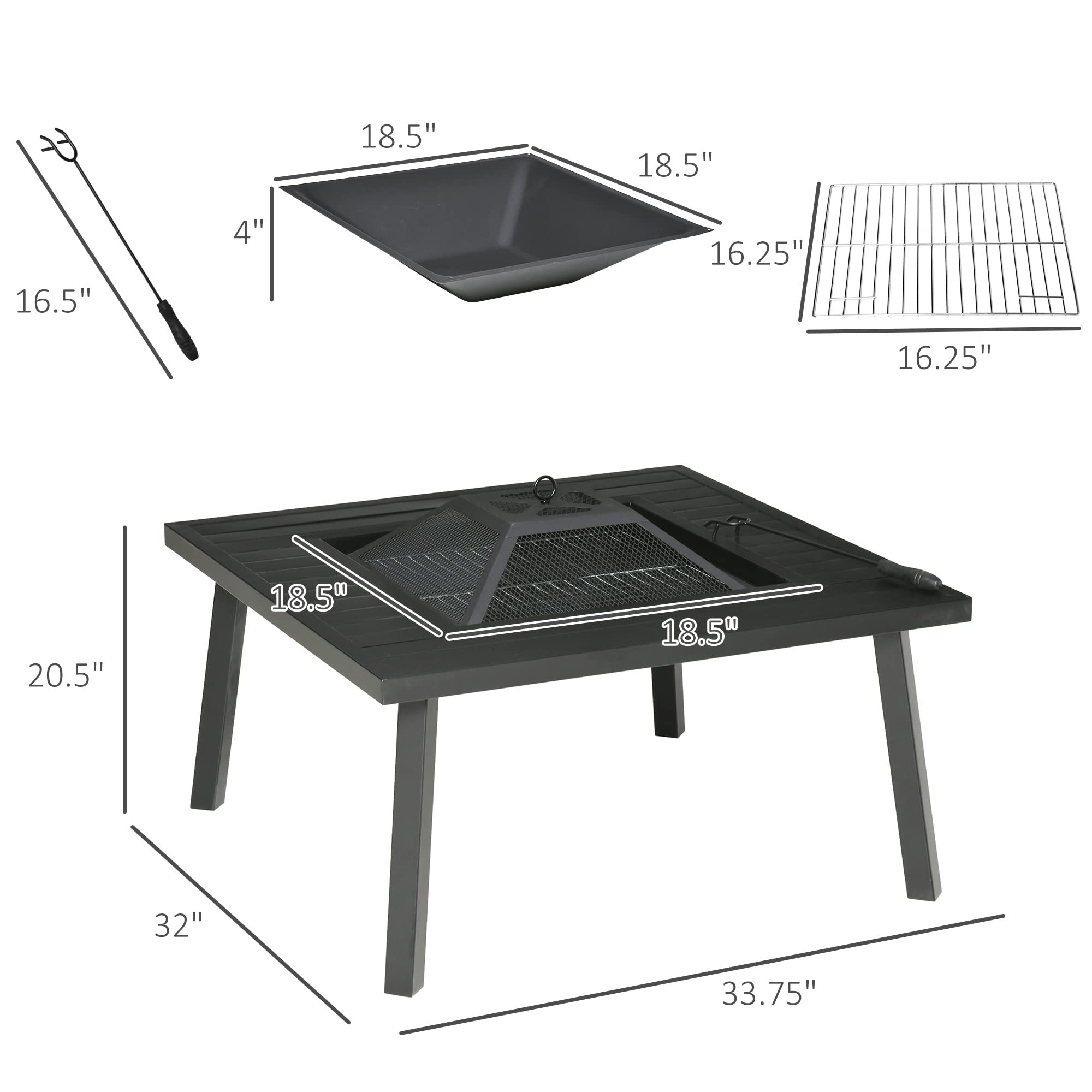 - Wood Burning Fire Pit with Grill Grate Info: Overall Size: 33.75" L x 32" W x 20.5" H. Internal Size: 18.5" L x 18.5" W x 4" H. Cover Size: 17.25" L x 17.25" W x 4" H. Grill Mesh Size: 16.25" L x 16.25" W. Poker Size: 16.5" L x 1.5" W. Waterproof cover included. Assembly required.