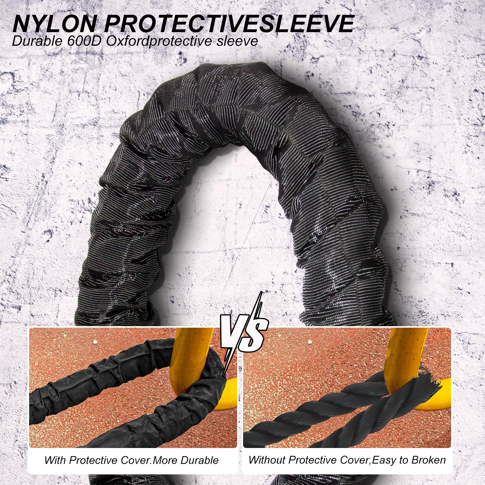 • Ultra-durable Structured Professional Battle Rope: The battle rope is made of durable three-strand 100% polyester filament material. A nylon protective cover is added on the outer layer. The high-tensile-strength exercise rope can prevent breakage, wear, or loosening, and is more durable than other exercise ropes without protective covers. This is a good choice for fitness enthusiasts for workouts in home gyms and outdoors.