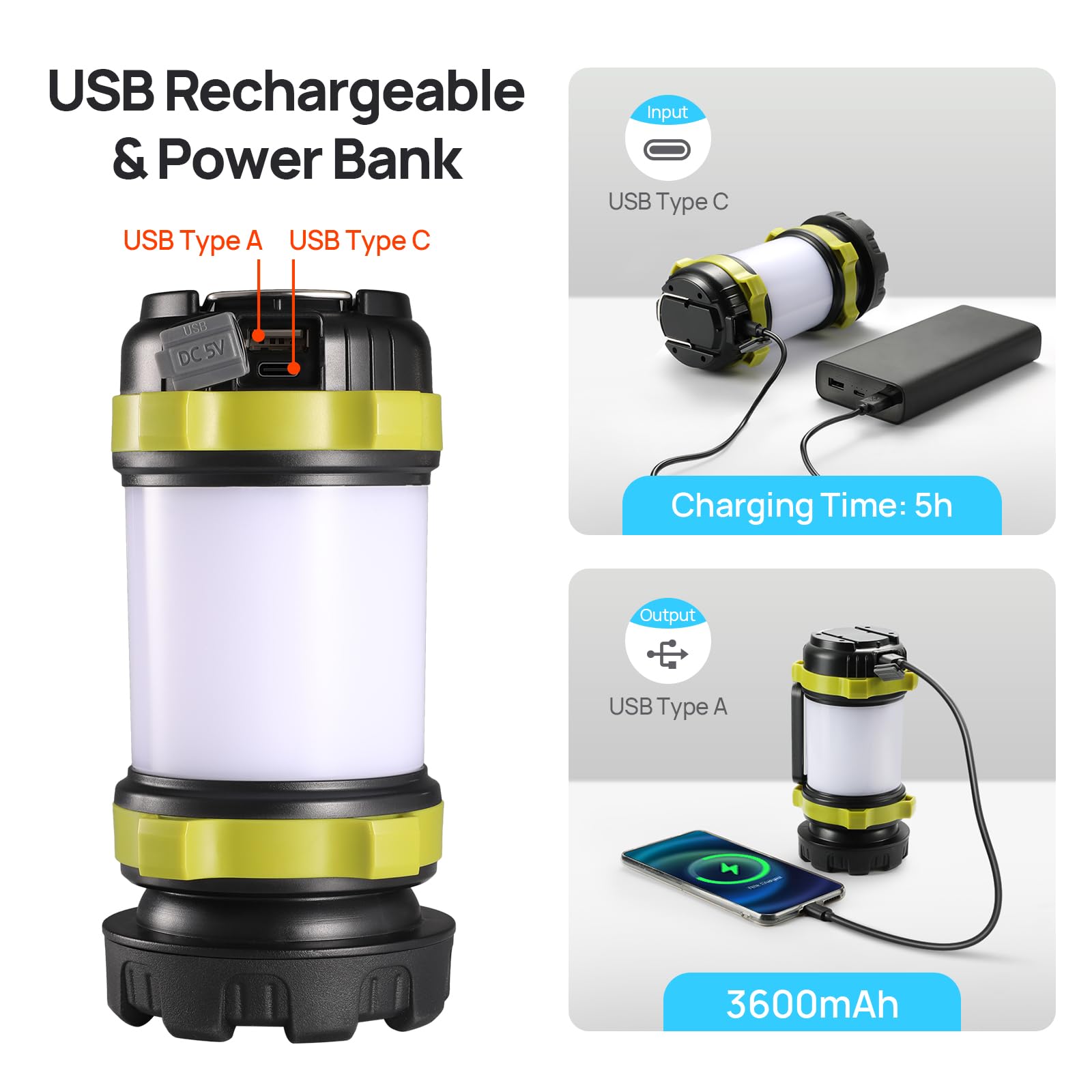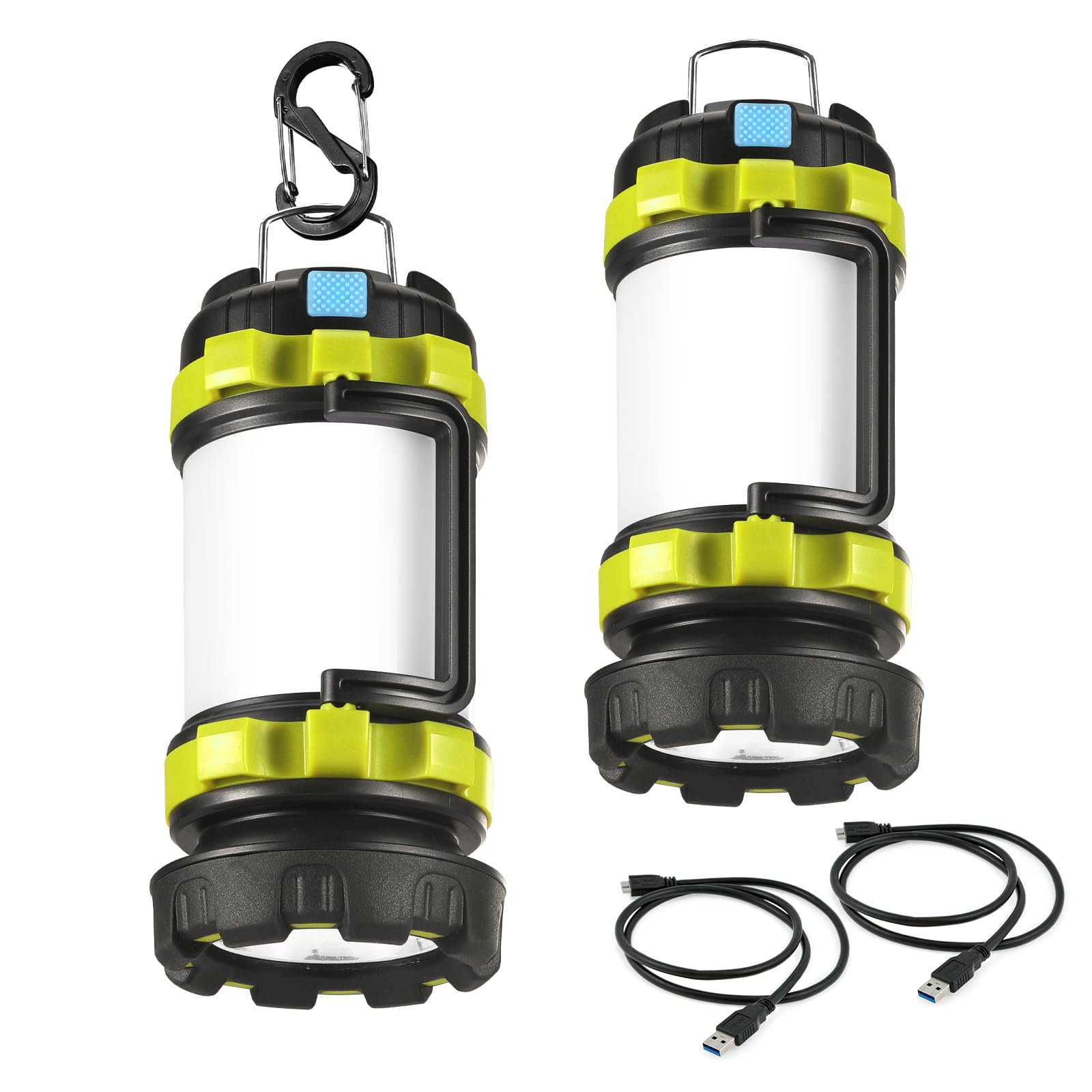 Details: Consciot LED Camping Lantern Flashlight Rechargeable; 2 Pack; Color: Light Green; 6 Light Modes; Red Light; 3600mAh Power Bank; IPX4 Waterproof; USB Rechargeable(USB-C Cable Included); Comfortable Carry Handle & Two-way Hook; Ideal for Camping Hiking Fishing Power Outages Emergency Hurricane Survival Kits; What You Get: 2*Camping Lantern Flashlight, 2*USB Type C Cable, 1*User Manual