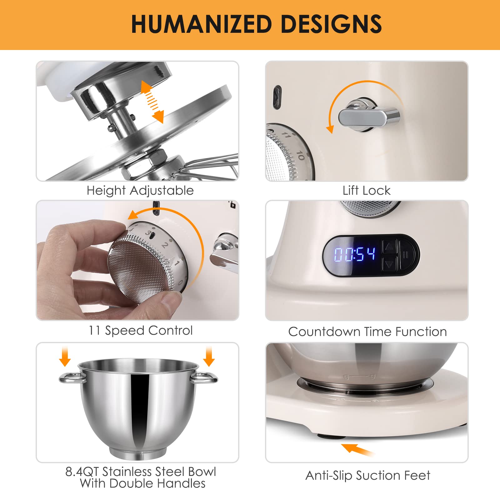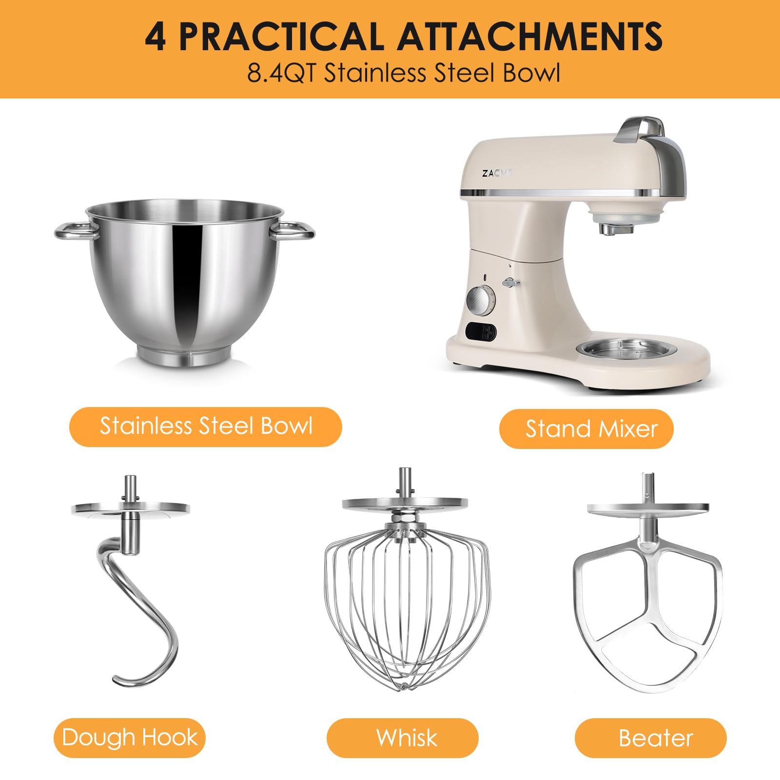 • Multiple Accessory Set: The stand mixer comes with mixing accessories - stainless steel dough hook, wire whip, flat beater, and 8.4QT capacity stainless steel bowl. All heights are adjustable to handle large & small quantities. It is your perfect kitchen accessory for frosting, meringue, creamy dressings, doughs, baked goods, and more.