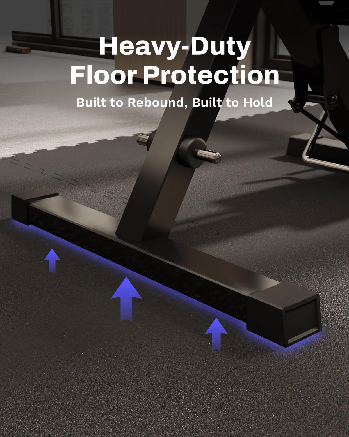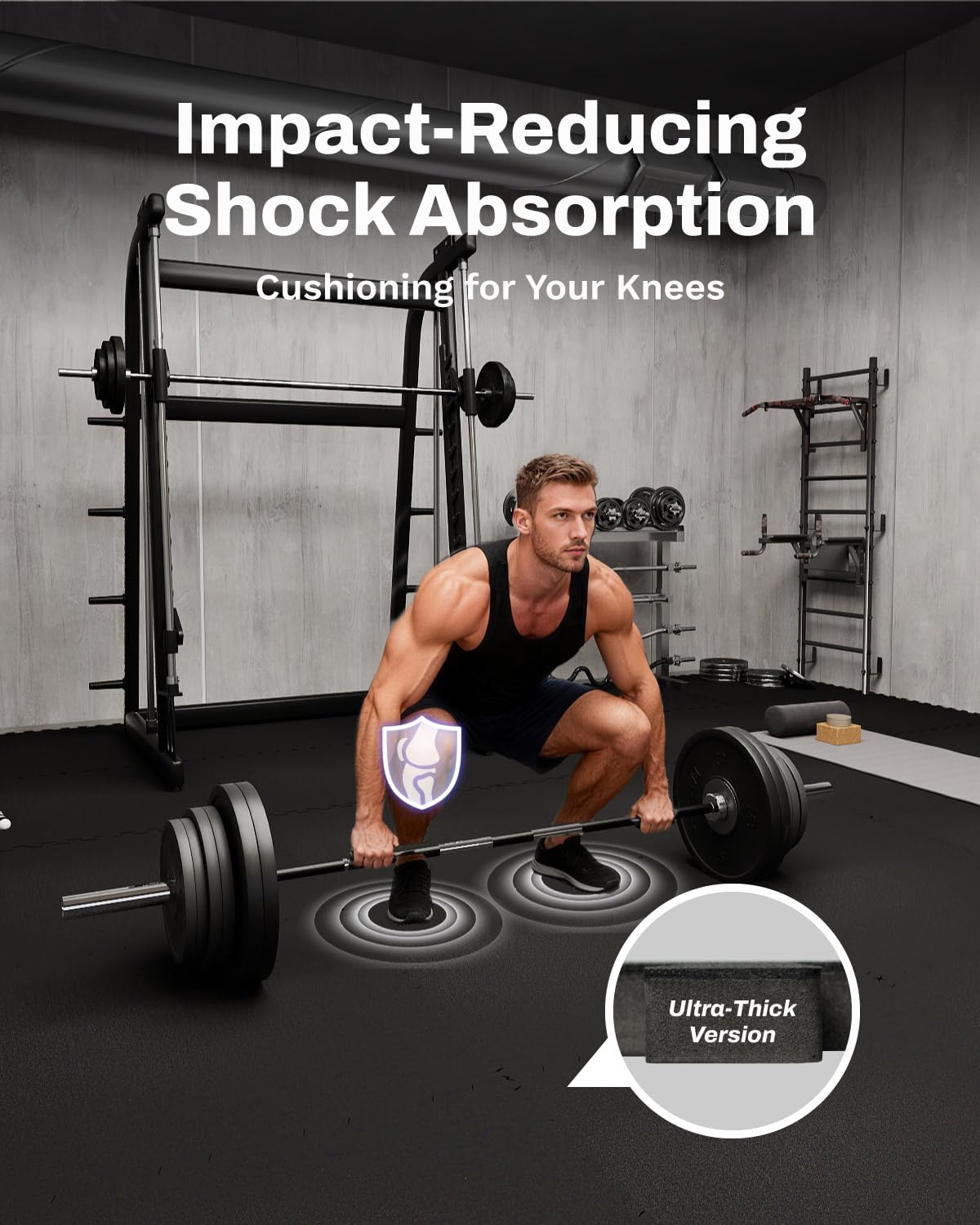 - [Sturdy Rubber Build]: Crafted from premium recycled rubber, our gym mats handle intense workouts with ease. These resilient tiles effortlessly support heavy machinery, providing reliable floor protection against scratches, scuffs, and dents from weights, dumbbells, medicine balls, jump ropes, and other workout gear in a home gym.