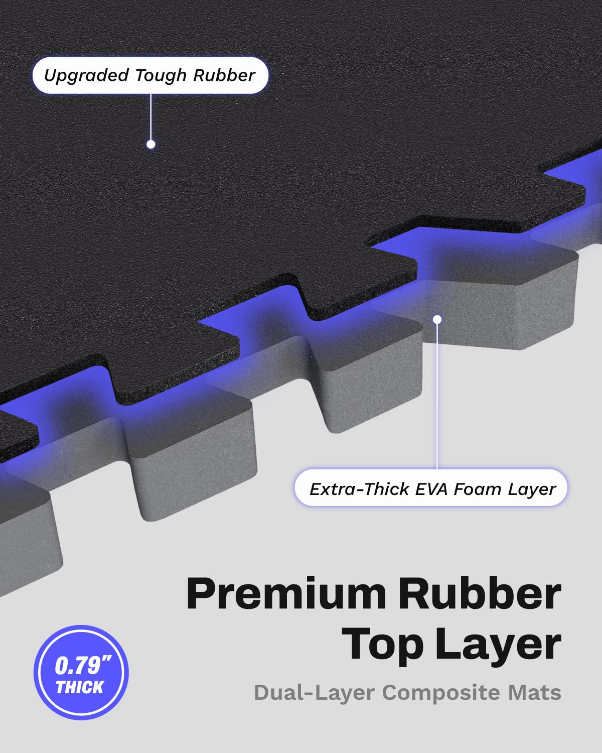 - [Upgraded Dual-Layer Design]: Concerned about your equipment scratching the floor during workouts? Our 2in1 Rubber Top EVA Foam Exercise Gym Mats are crafted to solve this issue. The textured rubber top layer, combined with a high-density EVA foam bottom layer, seamlessly creates a non-slip tough surface with excellent shock absorption.