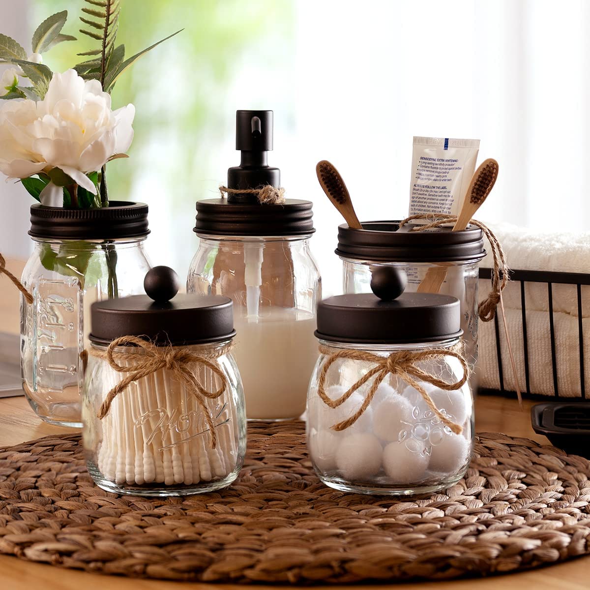Elevate your bathroom decor with the Amolliar Mason Jar Bathroom Accessories Set. This 4-piece set includes a lotion soap dispenser, two cotton swab holders, and a toothbrush holder, all in a charming rustic farmhouse style. Keep your bathroom essentials organized on your countertop with this stylish bronze set.