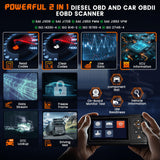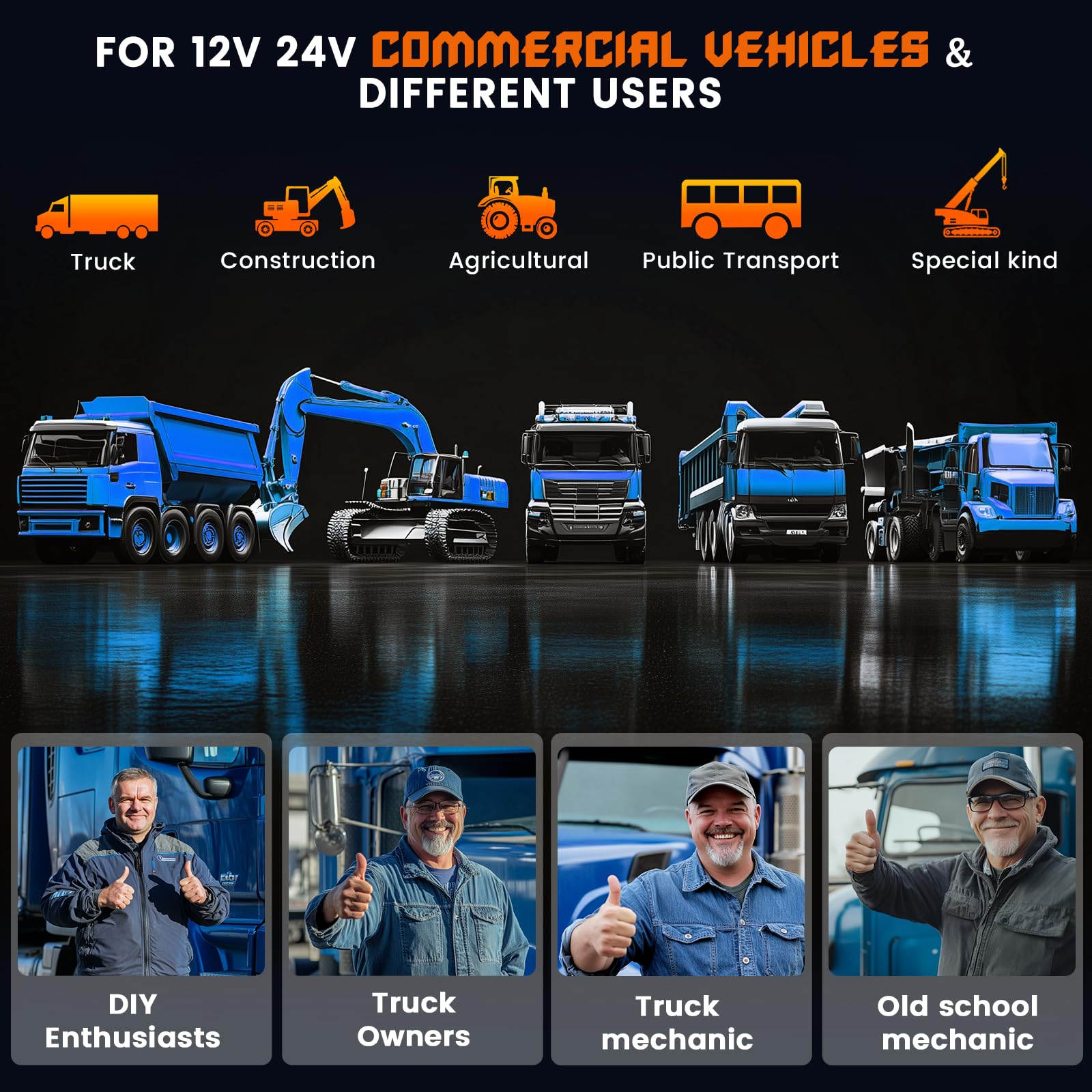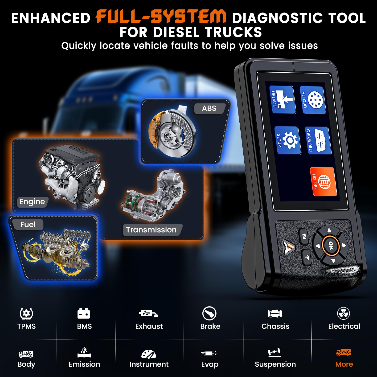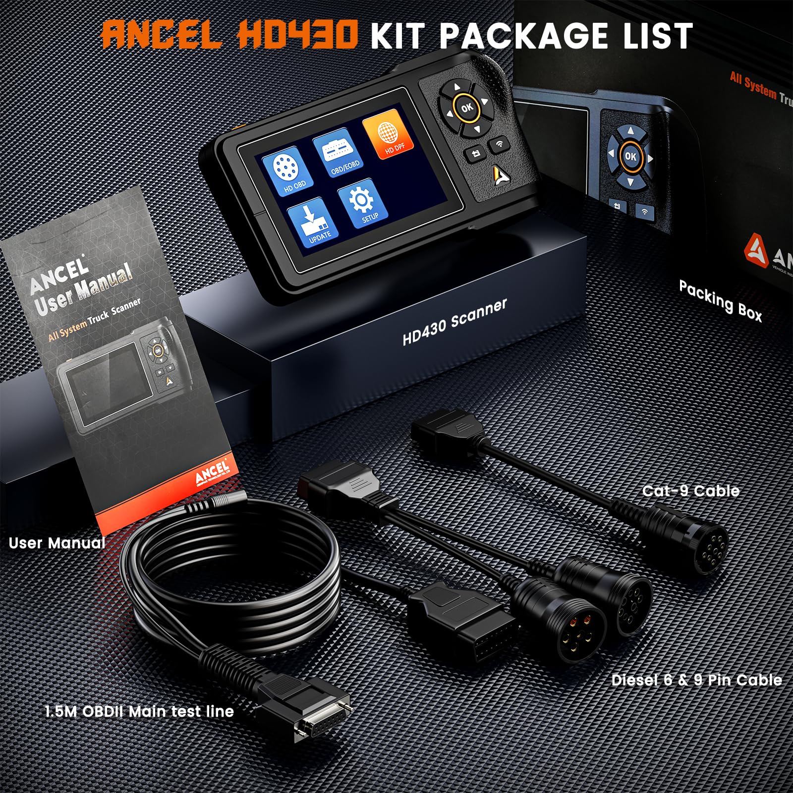 - 【Wide Compatibility】HD430 supports 12V 24V trucks, equipped with diesel connectors (cat-9, 6pin, 9pin) and OBDII standard connector, with strong truck adaptation and compatibility. Product supports SAE J1939, SAE J1708, SAE J1850 PWM, SAE J1850 VPW, ISO 14230-4, ISO 9141-2, ISO 15765-4, ISO 27145-4 truck protocols, provides complete scan & fast scan, and available in English and Spanish, it is suitable for DIY enthusiasts, old-school mechanics, truck owners or small repair shops.