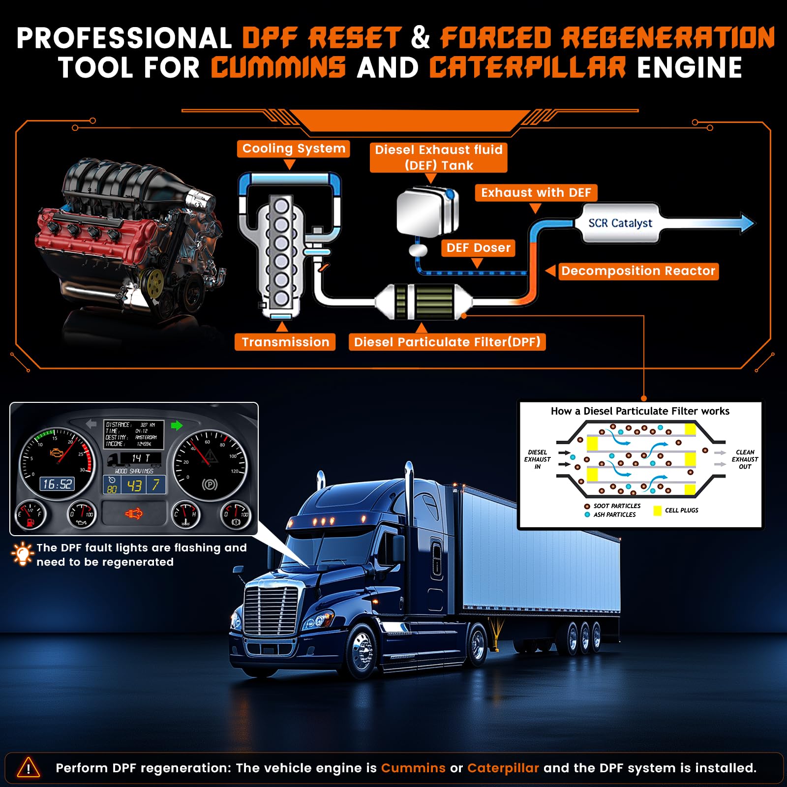 - 【 D-P-F Regen For Cunmmis & Caterpillar】HD430 supports Cummins and Caterpillar engines for D-P-F reset & regeneration, helping to remove diesel particles from truck D-P-F & meet maintenance schedules, thereby avoiding fault codes, maintaining engine performance, and extending DPF & truck life. Even if you aren't a professional mechanic, you can easily perform D-P-F regen using HD430 according to clear instructions, which can help your truck avoid roadside obstacles while reducing your repair time & cost.