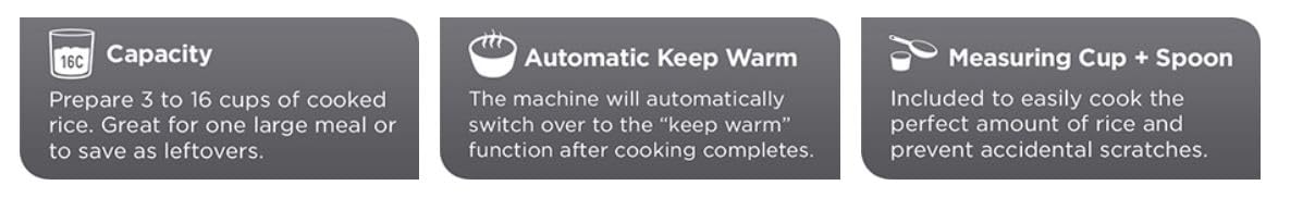 - AUTOMATIC KEEP WARM - The rice stays ready for serving! The unit automatically switches to the “keep warm” function after cooking is complete, keeping fluffy rice ready to serve long after cooking