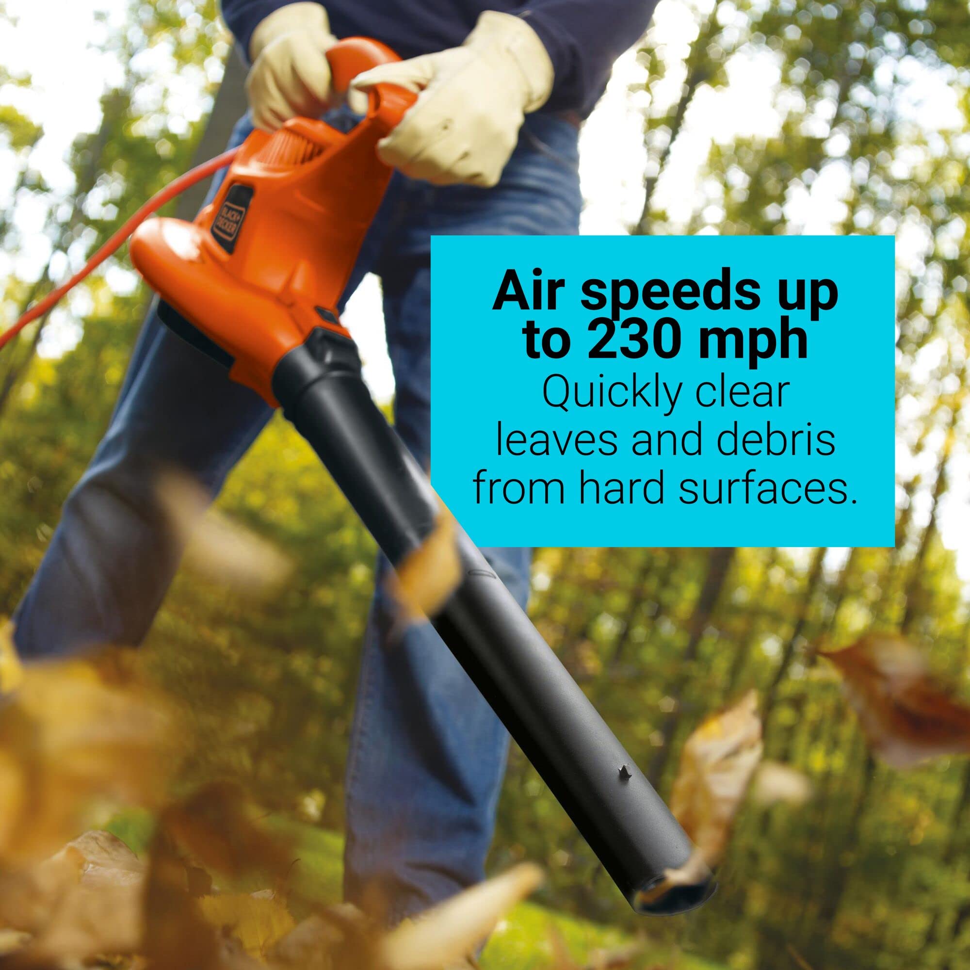 Details: Keep your yard looking its best with the versatile BLACK+DECKER electric 3in1 blower, vacuum, and mulcher. This corded blower is designed for seamless, tool-free conversion to each function and features air speeds up to 230 mph for powerful clearing of all types of debris. The 2-speed design lets you select the speed that works best: go with the lower setting for delicate areas like flowerbeds and the higher one for matted leaves. Plus, an anti-clog vortex impeller mulches leaves down from 10 bags to 1 for added cleaning convenience, and the built-in cord retainer ensures you remain plugged in for even the longest jobs.
