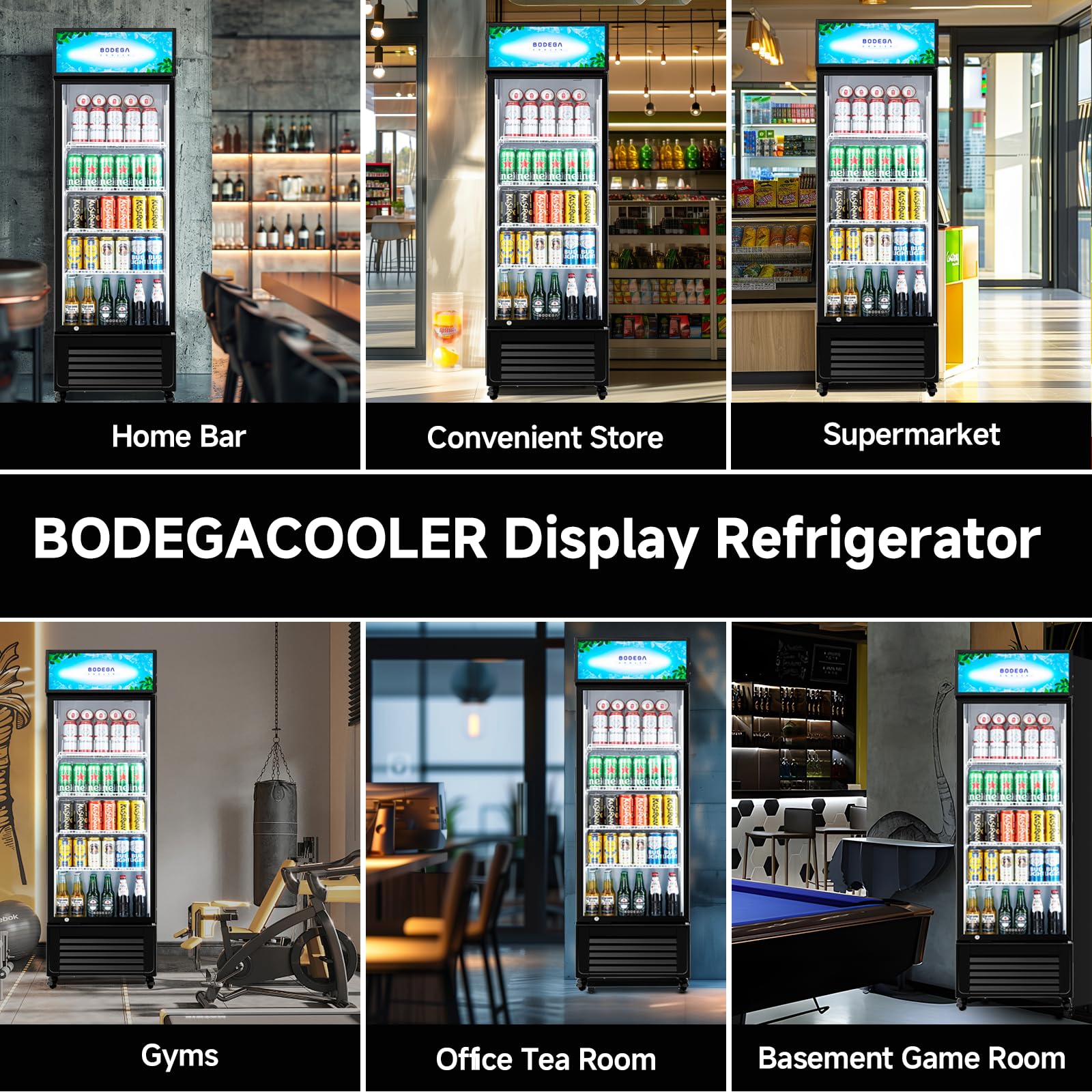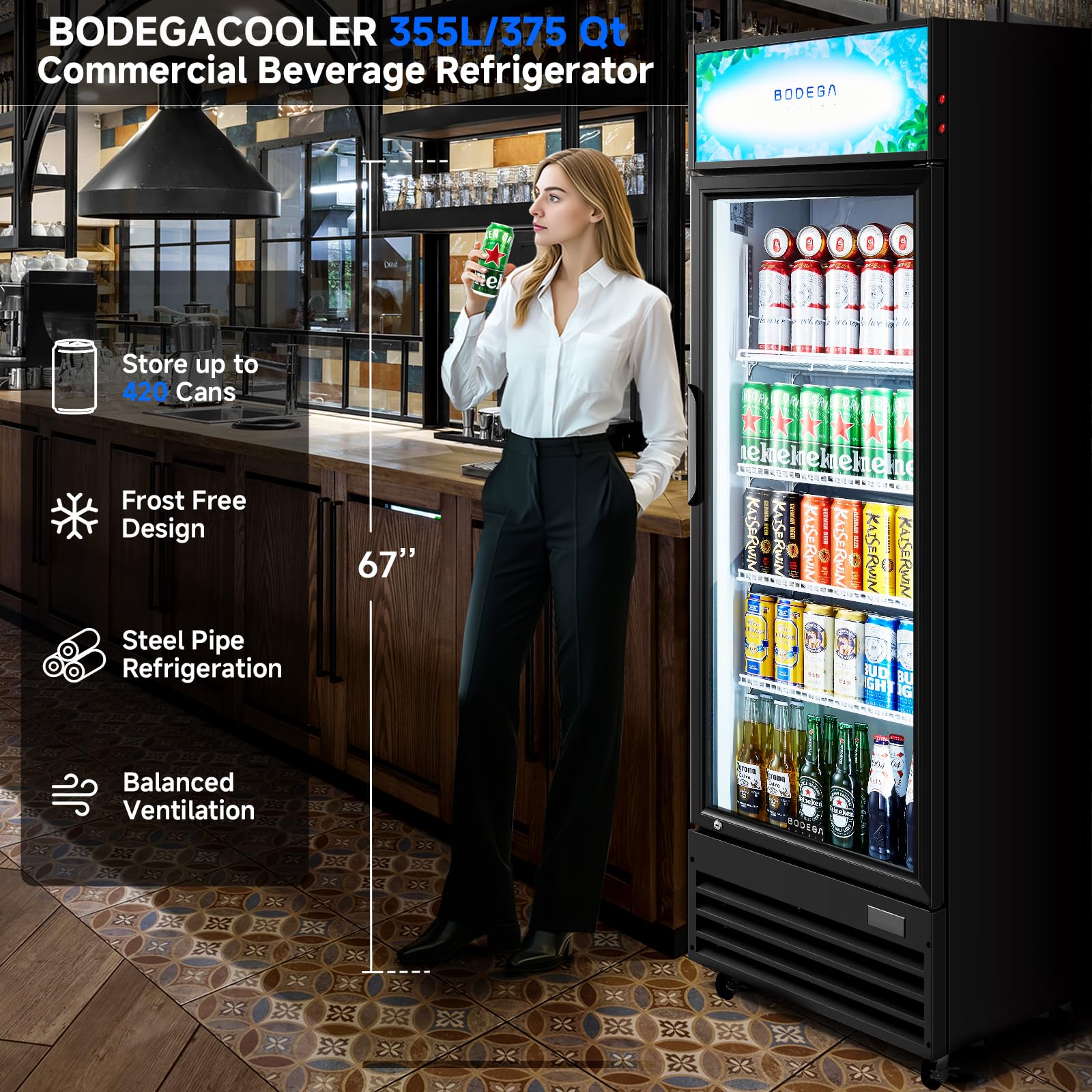 • 🍨【355L/375 Qt Capacity Commercial Refrigerator】 BODEGACOOLER commercial display fridge measures 22.6"D x 22.7"W x 77.9"H, with 355L/375 Qt capacity. The large black commercial cooler refrigerator glass door holds up to 420 standard soda cans or 160-750ML beverage bottles. Inside, it has 5 adjustable shelves and 10 shelf slots at different heights for flexible shelf adjustment to fit drinks of various sizes.