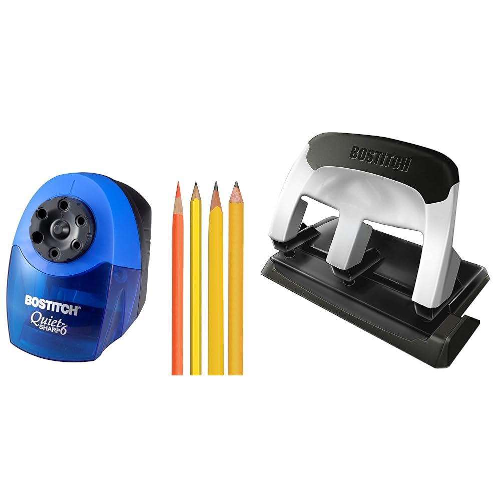 Details: This pencil sharpener and paper punch bundle is perfect for any office, classroom, or home office. The Bostitch Office QuietSharp 6 Electric Pencil Sharpener features a quiet, high-speed motor that can sharpen a pencil in under 4 seconds. Its durable helical cutter has a 10 times longer life and Tip Saver Technology prevents over-sharpening. With an oversized base for stability and a large shavings receptacle, this sharpener can handle high volumes of pencils. The 6-size selector allows you to choose from 6 pencil sizes. Pair it with the Bostitch Office EZ Squeeze Heavy Duty 3 Hole Punch that requires 50% less effort to punch thanks to its EZ Squeeze technology. Its all-metal design provides long-lasting performance while the integrated paper guide ensures consistent 3-hole placement. The punch cleanly cuts 1 to 40 sheets of paper and has an easy-clean chip tray and non-slip base for tidiness and stability. With fast, efficient electric sharpening and an easy-to-use hole punch requiring less effort, this bundle has all your office and school supply needs covered.