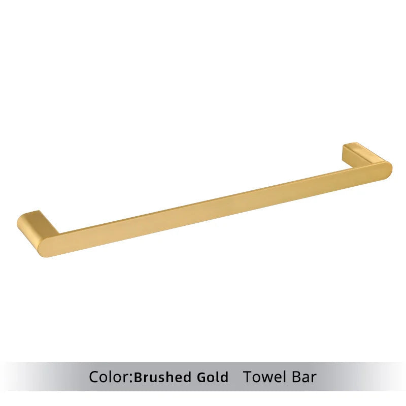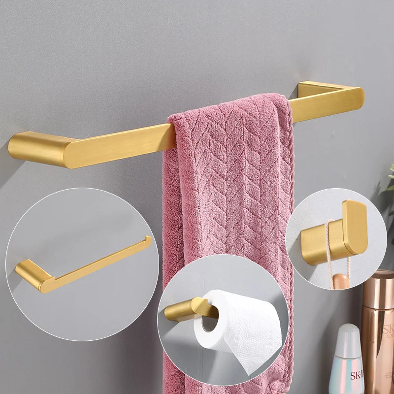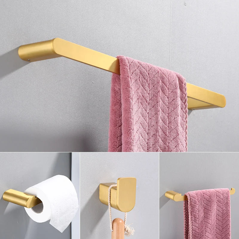 Elevate the look of your bathroom with this luxurious Bathroom Towel & Toilet Roll Holder Set in Brushed Gold. This set includes a 4-piece set of wall-mounted accessories, featuring a towel bar and robe hooks. Keep your bathroom tidy and organized while adding a touch of elegance with this sleek and stylish set.
