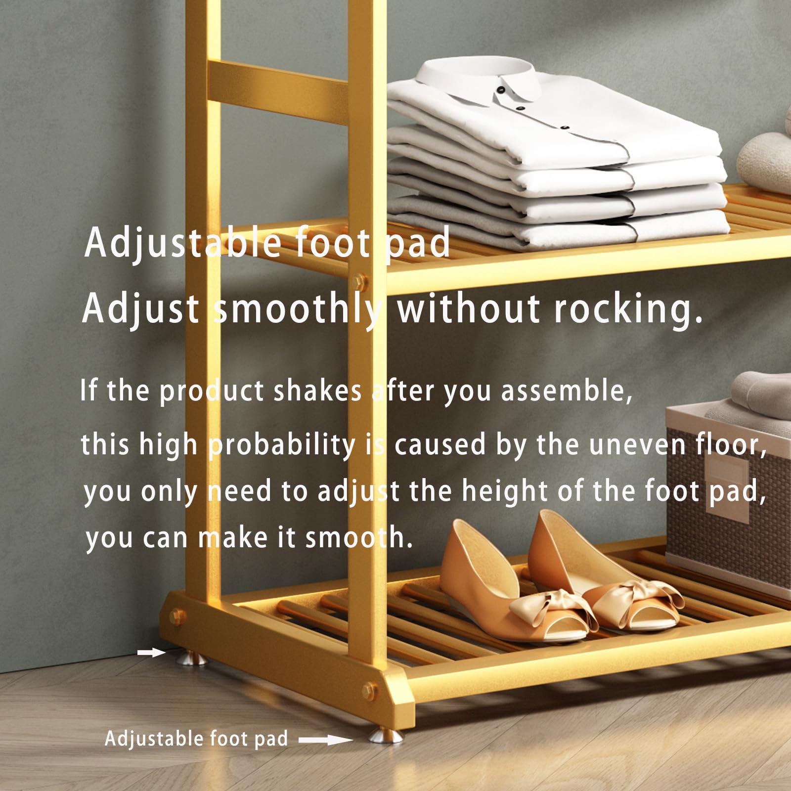 - 【Expand Your Storage】Gold heavy duty clothing rack with shelves. The hanger is designed with curved elements for a more elegant appearance. The top hanging rod can hang more than 20 pieces of clothes, and the distance from the bottom shelf is long enough, so that you hang coats, dresses and other long clothes will not wrinkle, and the bottom adds two layers of storage shelves to expand the storage space. There are 6 hooks on the side frame to hang your bag, hat, scarf, gloves, etc.