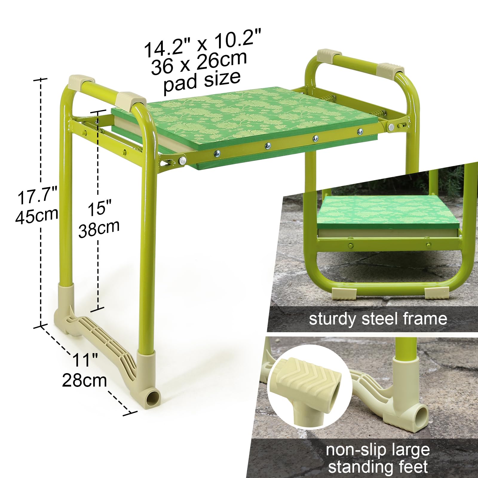 - GOOD HEIGHT OF THE HAND RESTS -- this garden bench for kneeling and sitting features a good height for pushing back up using the hand rests from a kneeling position. The height of the hand rests is just right for the correct amount of pressure from my arms and not just your wrists. 14.2" X 10.2"(L*W), wider thick kneeling pad ensure more back and knee support when you're sitting or kneeling.