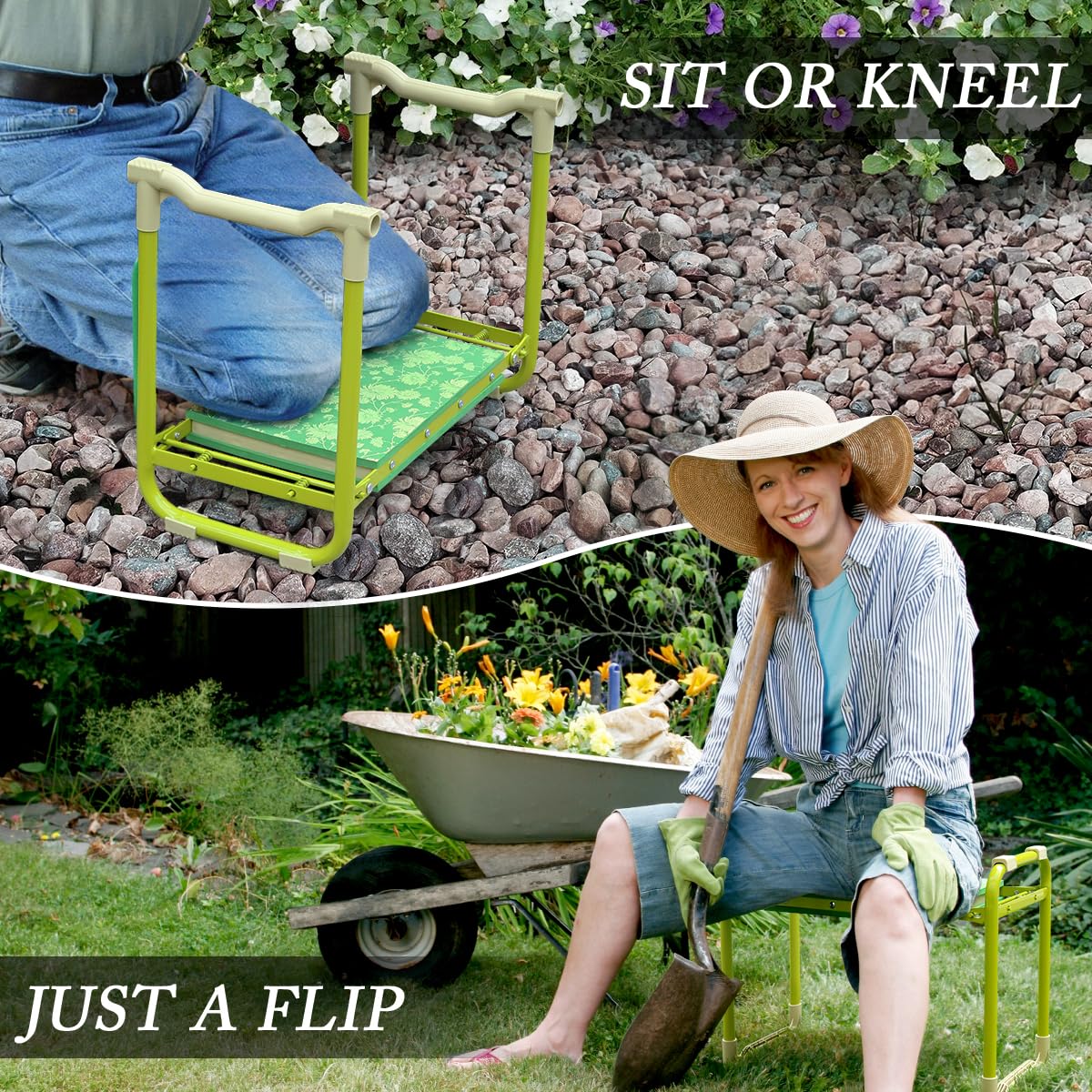- SIT OR KNEEL, JUST A FLIP -- this garden bench for kneeling and sitting is versatile and can be flipped one way or the other to be used as a seat or kneeling pad. For pruning tomatoes in an in-ground garden patch, choose the kneeling side to get closer to your plants. Tired from gardening activities? Take a seat and have a rest to enjoy your masterpiece! Not merely for gardening, you can sit or kneel on the garden bench to perform outdoor & indoor home repairs or give your kids or pets a bath.