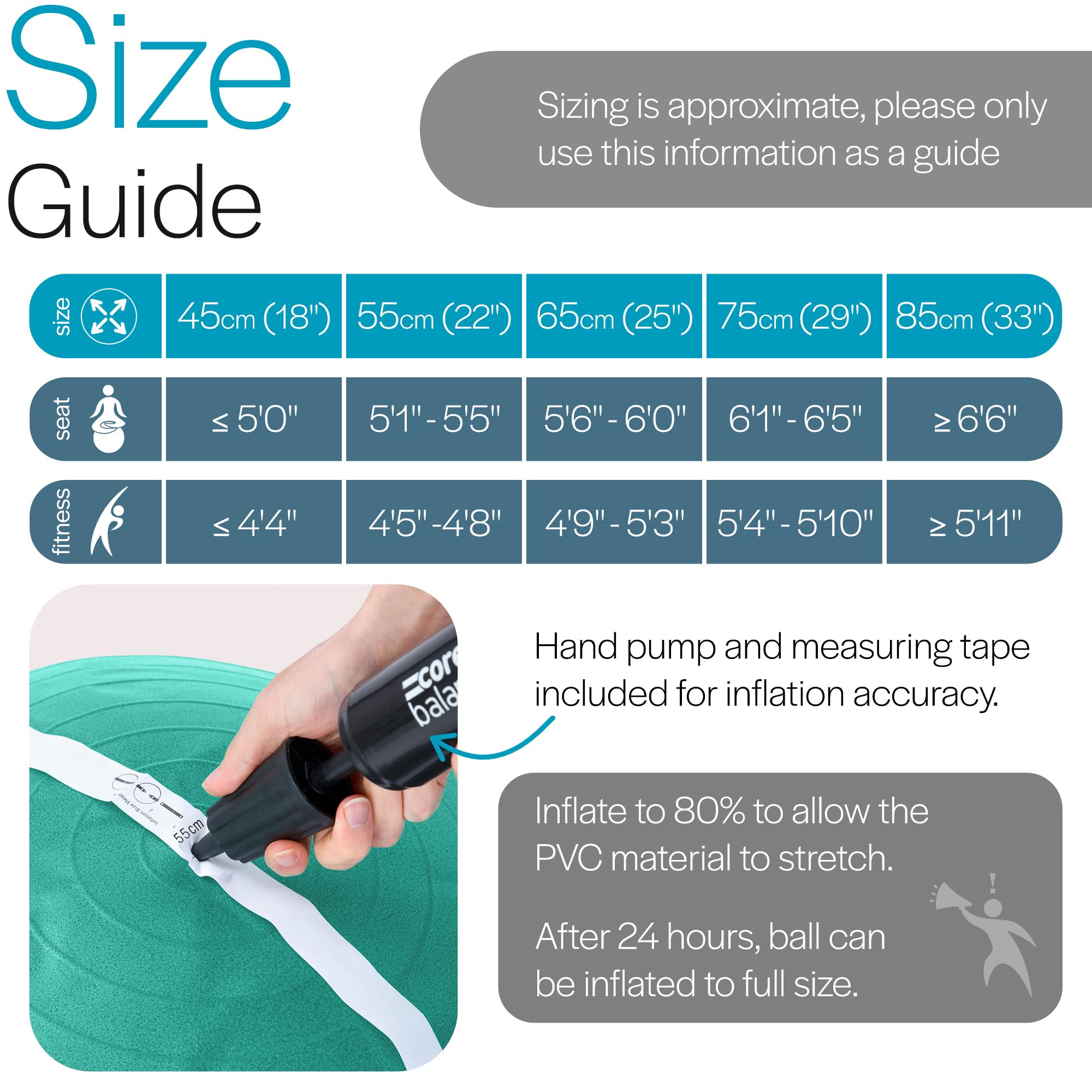 Core Balance Exercise Ball for Workouts, Anti-Burst and Slip Resistant, Swiss Yoga Ball for Pregnancy, Stability, Fitness and Physical Therapy, 4 Sizes, with Pump (25" / 65cm Teal)