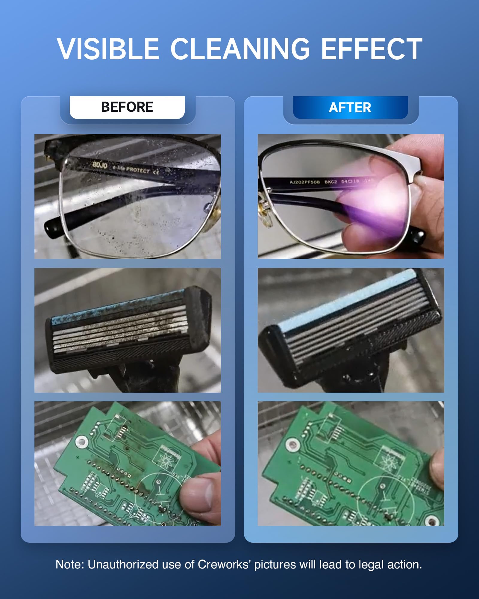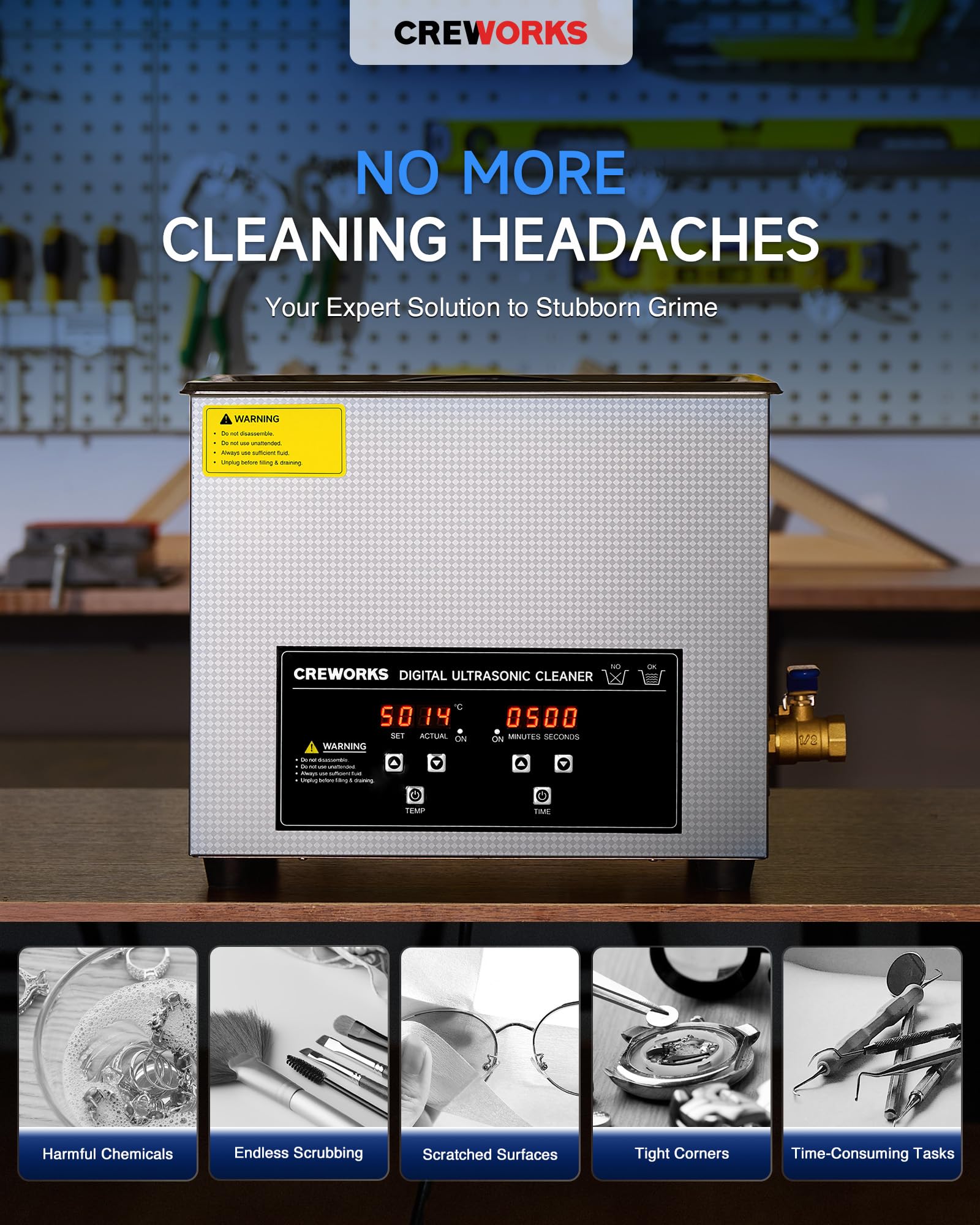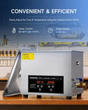 - 240W ULTRASONIC POWER: This Creworks industrial ultrasonic cleaner uses 240W of power to fill its 2.6 gallon basin with cavitation bubbles, using the force of their tiny implosions to thoroughly and professionally clean even small and intricate surfaces; up to 250W of heating allows even more powerful action