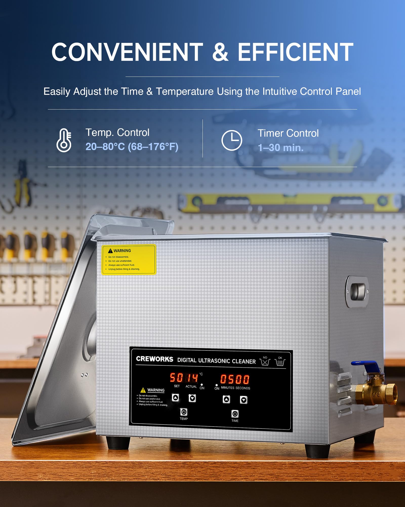 - CONVENIENCE AT ITS CORE: Designed with your convenience in mind, this ultrasound cleaner boasts inset handles for easy and smooth transportation, coupled with a built-in drain valve that simplifies the cleanup process