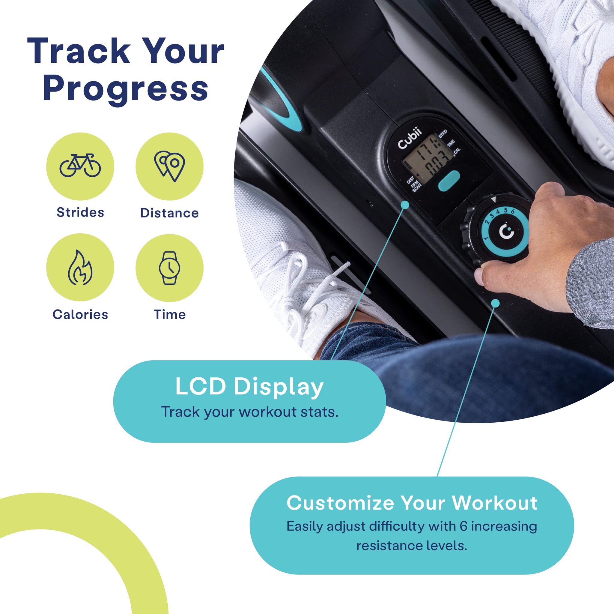 • BUILT IN LCD DISPLAY PROGRESS TRACKER - The easy to read LCD monitor displays your stride count, mileage, duration, and calories burned so you can track your progress. Manually enter stats to the Cubii App for an interactive fitness experience.