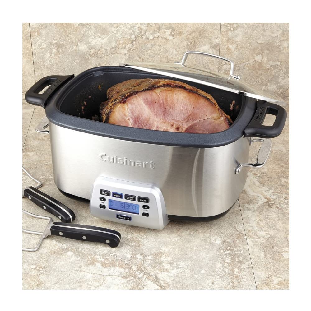 Details: With the Cuisinart 7-Quart 4-in-1 Cook Central Multicooker, you can do it all without firing up the stovetop. Brown ingredients in the Cook Central and then Roast or Slow Cook with one button for effortless one pot combination cooking. Presets, time, and temperature controls make it simple to Slow Cook, Roast, Brown/Sauté, or Steam alone, or in combination! The Cook Central® makes dinnertime easy and programmed ahead of time so your meal is done exactly when you want it, with the Keep Warm feature making sure heavy commuter traffic doesn't mean your meal will be cold! The cast aluminum pot is also removable and nonstick for easy clean up, no matter how slowly you roast sticky pulled pork.