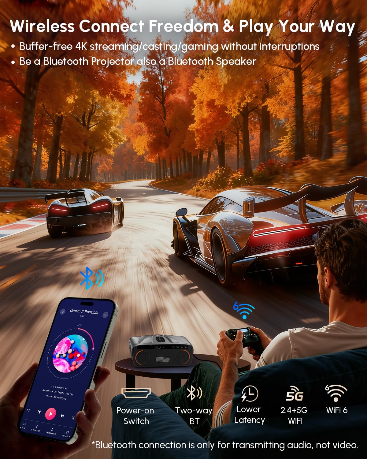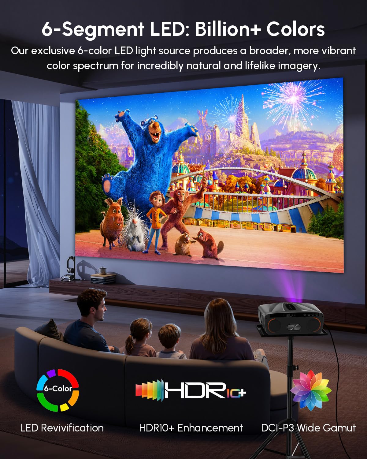 • [4K HDR Support with Stunning Colour Accuracy] Equipped with the high performance MTK 9660 chip, native 1080P resolution, 4K & HDR10+ support and a wide colour gamut, this ultra hd projector offers excellent colour reproduction and detail. Built in colour compensation technology enhances contrast and clarity, giving you a more immersive big screen experience for films, sports and gaming.