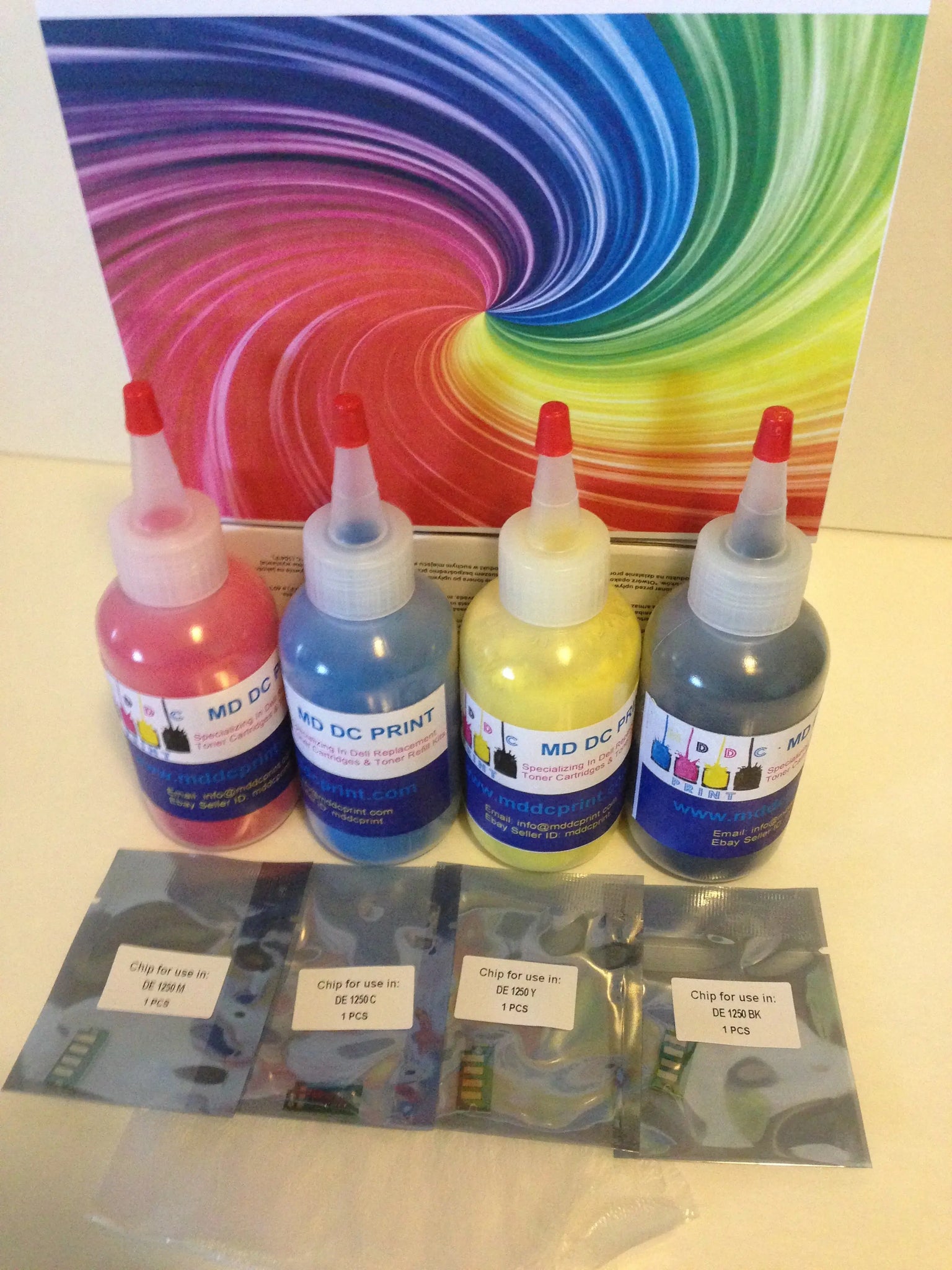 Dell 1355CN Laser Printer CYMK Complete Toner refill Kit + 4-Resetting Chips.