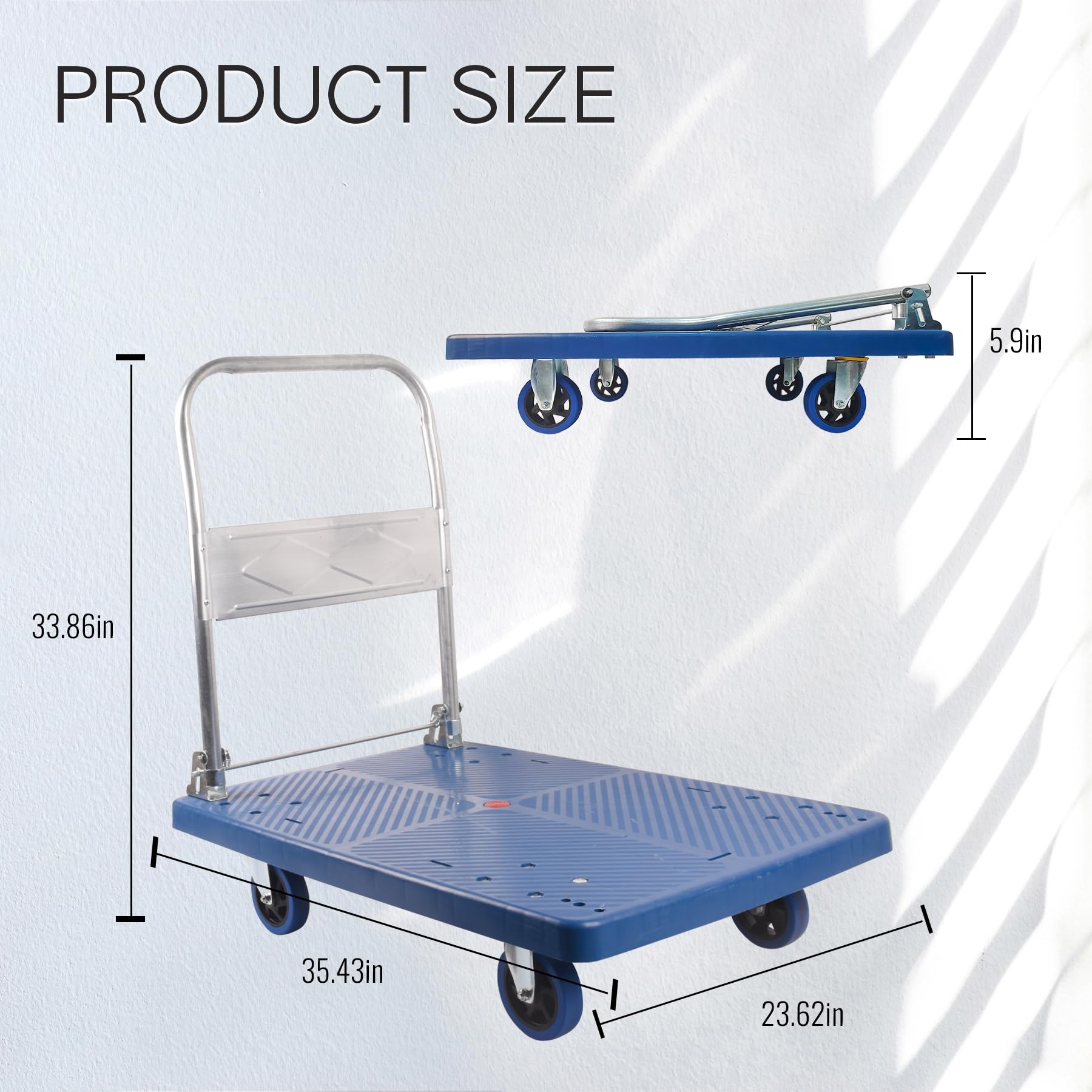 - PLATFORM TRUCKS SPEC - The platform is made of PP plastic, and the push handle is made of carbon steel galvanized. The platform dolly measures approx 35.43" x 23.62". Expanded size is appro 35.43" x 23.62" x 33.86". Folded size is approx 35.43" x 23.62" x 5.9".
