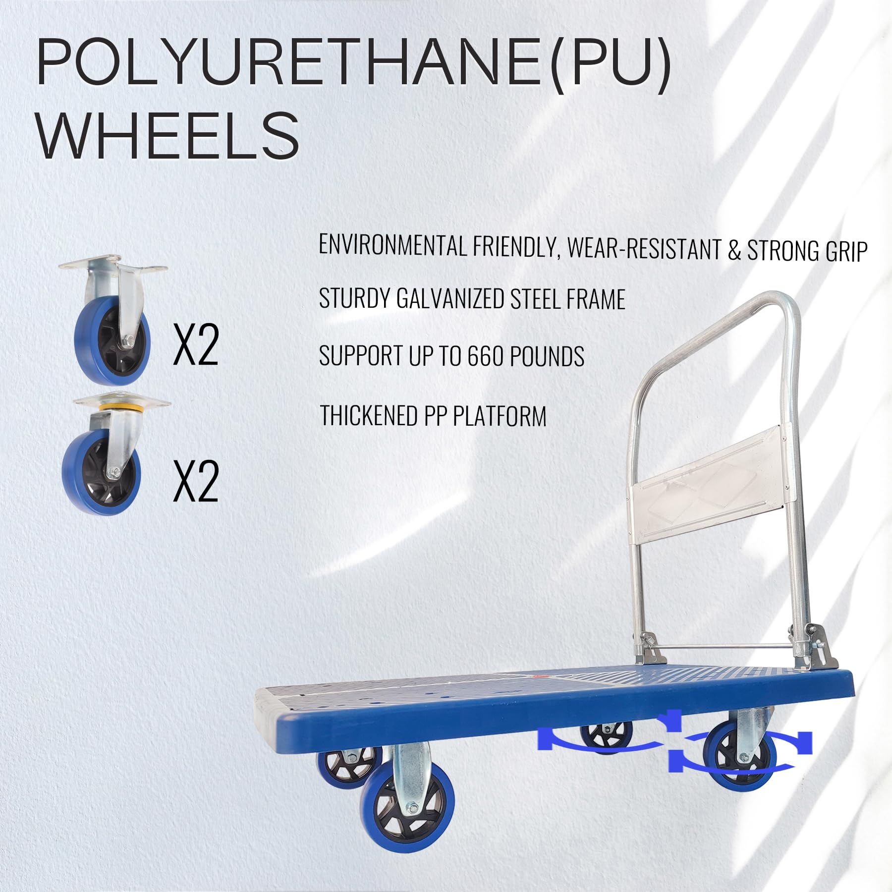 - EASY TO MANAGE - This flatbed cart features four 4-inch wheels for maximum maneuverability, quietness and stability. Larger wheels help our platform trucks move easily over rough terrain. The two swivel wheels can adjust the direction, and the 2 rear wheels are designed with a 360-degree swivel function for easy transportation.