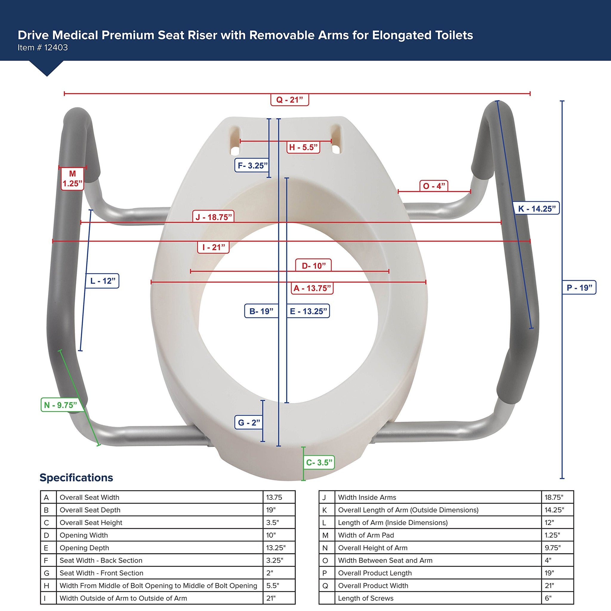 Elevate your bathroom experience with the Drive Medical Premium Seat Riser with Removable Arms. This innovative elongated seat is designed for maximum comfort and stability, measuring 19.25x13.75x3.5 inches. Easily attachable and featuring removable arms, this pack of 1 seat riser is the perfect addition to any modern bathroom.