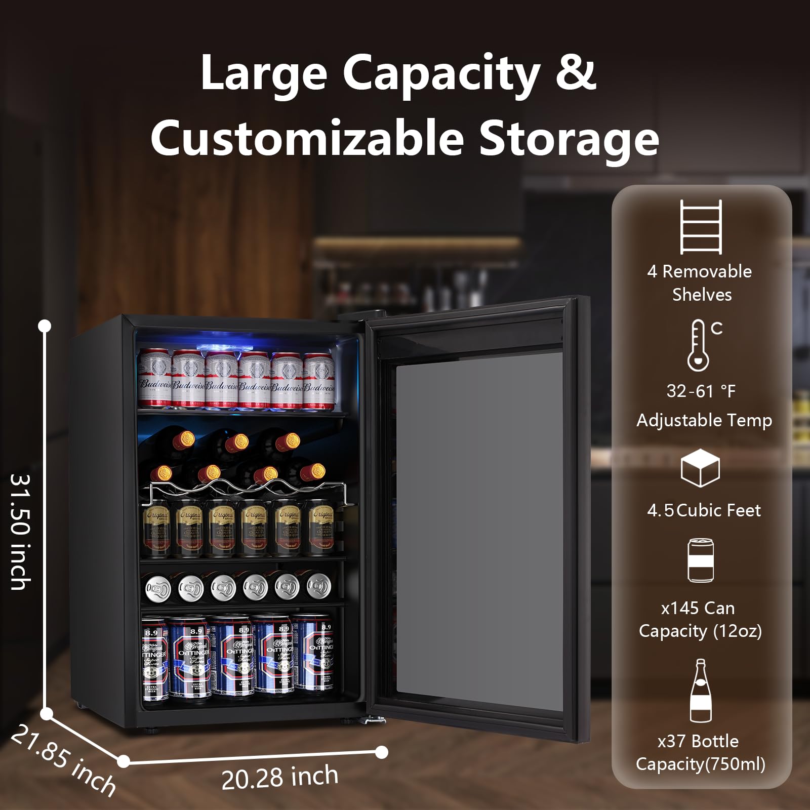 • [Versatile Beverage Storage]: Whether you are preparing for a party or you want to enjoy fresh drinks anytime, the 4.5 cu.ft beverage refrigerator can fit up to 145 standard cans! Fresh, cool beverage anytime!