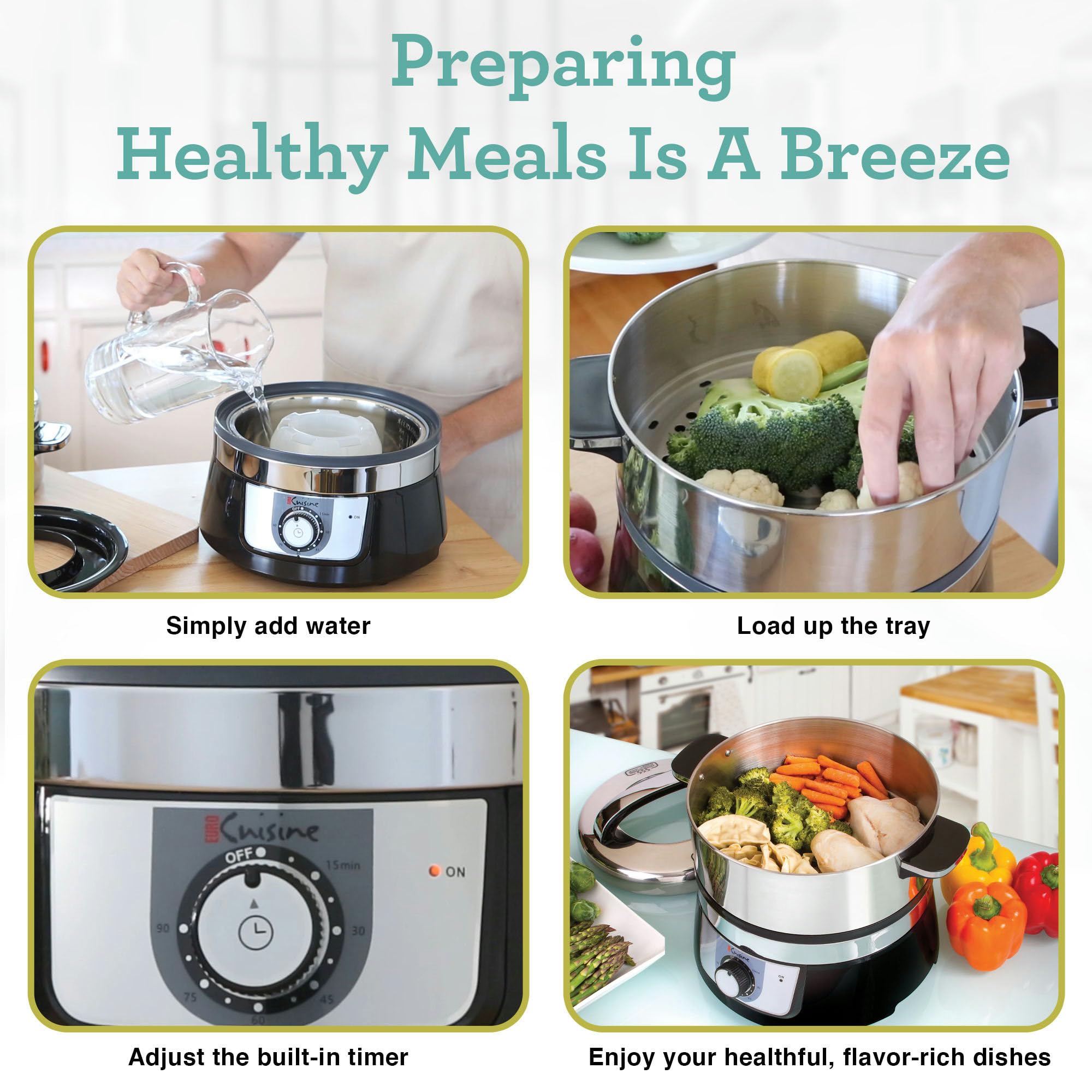 Details: Discover the joy of healthy and effortless cooking with the Euro Cuisine Electric Food Steamer, a versatile kitchen essential that brings the power of steam pot electric cooking right to your countertop. This innovative appliance is not just a veggie steamer pot; it's a comprehensive solution for preparing a wide range of nutritious, vitamin-packed meals. Designed with functionality and ease of use in mind, the Euro Cuisine steamer features a robust 1200 Watts of power, instantly steaming your favorite foods. From delicate fish to hearty red meat, tender poultry to succulent shellfish, and even tofu, vegetables, and grains, this steamer handles it all with ease. The possibilities are endless, allowing you to get creative with your culinary creations. What sets this food steamer pot apart is its built-in 90-minute mechanical timer with an auto shut-off function, ensuring your meals are cooked to perfection without the need for constant supervision. The power indicator light offers added convenience and safety, making it an ideal choice for any home cook. The countertop-friendly design of this steamer cooking appliance is perfect for both large family meals and intimate dinners. Its ability to keep different flavors separate on each tray is a unique feature, ensuring that every dish retains its distinct taste and aroma. Plus, with no oil, mess, or smoke, cleaning up is a breeze, saving you time and effort after meal preparation. Crafted with a durable stainless steel steam basket and water holder, this steam cooker promises long-lasting performance and reliability. The removable tray provides ample space for all your favorite foods, from juicy chicken and crisp vegetables to fluffy rice and beyond. Whether you're a seasoned chef or a beginner in the kitchen, the Euro Cuisine Electric Food Steamer is an essential tool for anyone looking to prepare healthy, flavorful meals with minimal effort. It's not just a vegetable steamer electric; it's a gateway to a world of delicious, nutritious, and effortlessly prepared dishes.