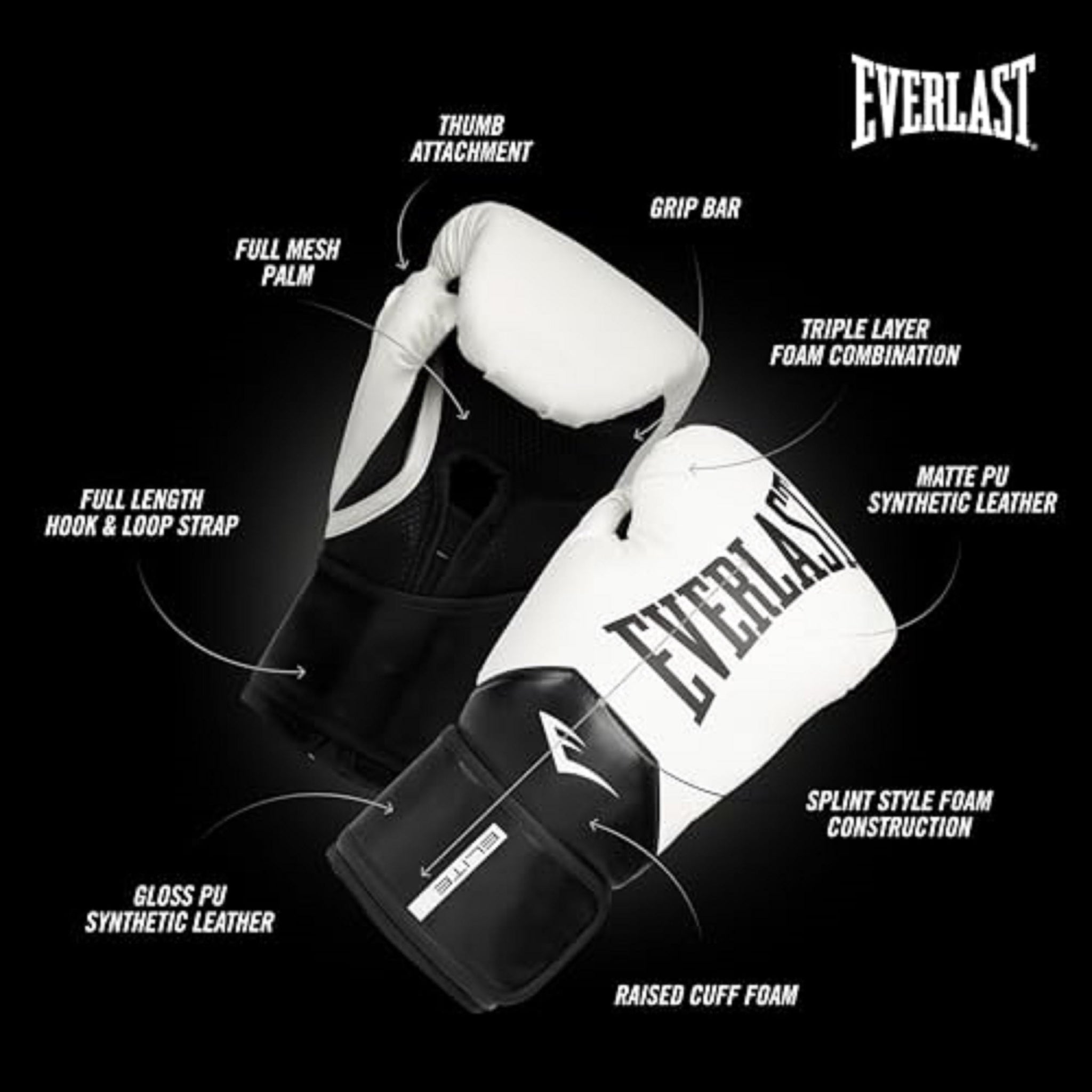 Details: The Everlast Elite 2 Boxing Gloves are the ultimate choice for fighters and trainers looking for maximum support and protection. Featuring a wedge-shaped full-length hook and loop strap for a secure fit, and an integrated palm foam section for increased protection, these gloves are designed to take your training to the next level. The triple-layer foam combination provides mid-level impact absorption, while the EverCool mesh palm increases ventilation to keep your hands cool and dry. The splint-style foam combination offers elite wrist support to prevent injuries, and the raised cuff panel deflects strikes during blocking. With an ergonomically correct foam grip bar and attached thumb, and a soft touch polyester lining for added comfort, the Everlast Elite 2 Boxing Gloves are the ultimate training companion.