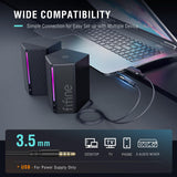 - [Controllable RGB for Gaming Ambiance] Elevate your gaming setup to the next level with gaming speakers for desktop computer featuring controllable RGB with 6 kinds of dynamic modes and 7 color options. The LED speakers adds a dynamic visual dimension to your gaming experience. Tailor your gaming environment to match the mood and atmosphere of more scenario, amplifying immersion and enhancing overall gaming enjoyment.