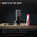 - Warm Tips: 1. The recording studio product (XLR cable, boom arm, mic stand not included) comes with a dynamic microphone with shock mount, an 8.2ft (2.5m) USB C to USB cable, a 5/8'' to 3/8'' adapter, a user's Manual. 2. When using XLR connection, it is suggested to use XLR to XLR cable for more stable audio. 3. All function keys are only available for USB connection.