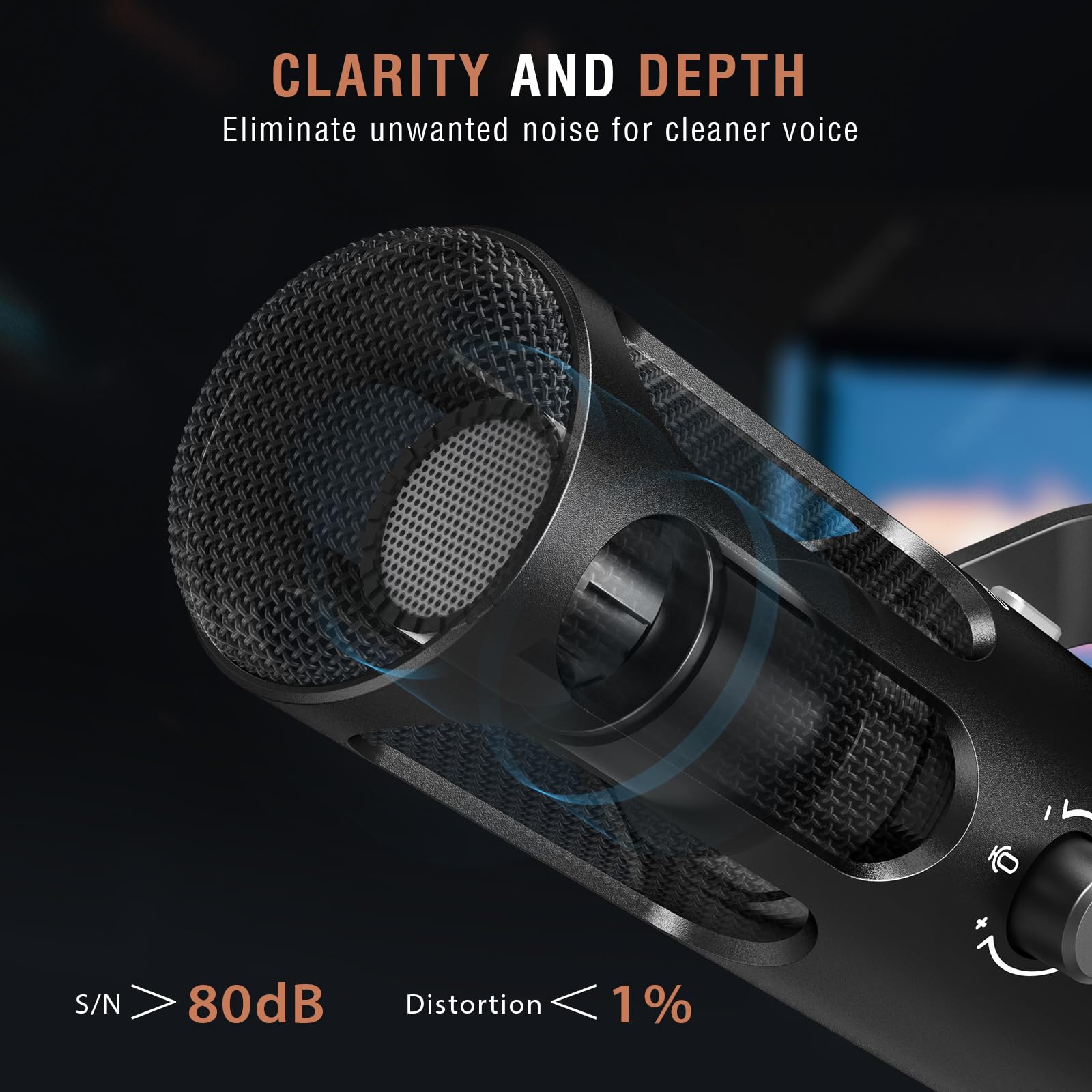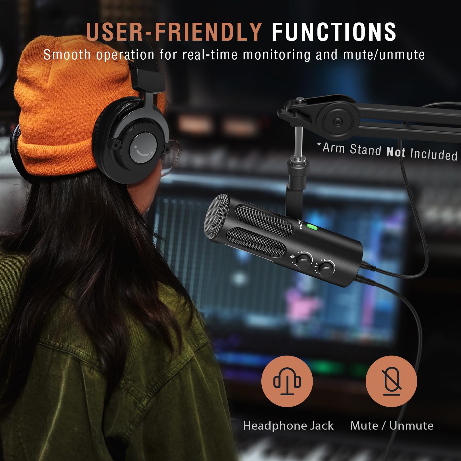 - [Mute and Monitoring] Use a finger on the front of the USB microphone for PC and easily mute or unmute during recording via the silent mic mute button that was a physical button to avoid mute being triggered by mistake. The USB podcast microphone features a monitoring headphone jack to let you keep concentration on real-time audio without plugging in headphones elsewhere.