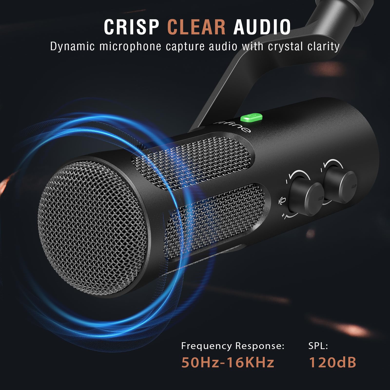 - [Rounded Rich Audio] The recording studio microphone has a lower self-noise, which is crucial when capturing subtle details and maintaining a clean signal in quiet studio settings. Dynamic microphone with noise-reduction and shock-absorbing effectively reduces unwanted back-ground noise, allowing your voice to shine through in podcast or streaming scenes that require clear communication.(Tip: You can speak to the top of the end addressing microphone within a range of 2 to 6 inches for clear sound)