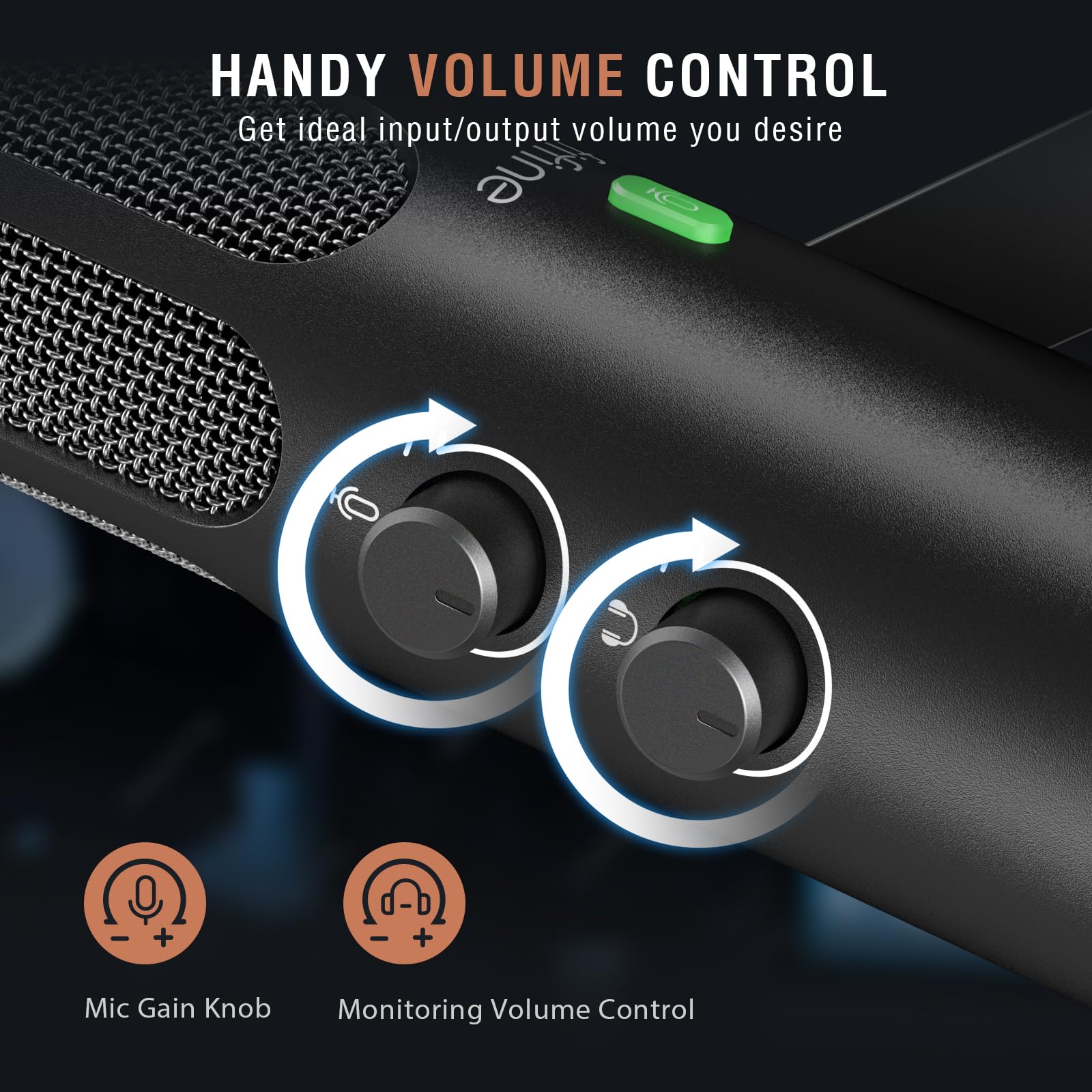 - [Volume Control] Recording with the USB connection of studio microphone, you will get adjustment of input mic gain and headphones output volume. Volume knobs on the side of the computer recording microphone are easily accessible. You can directly adjust the mic gain volume without having to yell or whisper and control the monitoring output volume to concentrate on podcast recording, but no having to distract yourself with other computer settings.