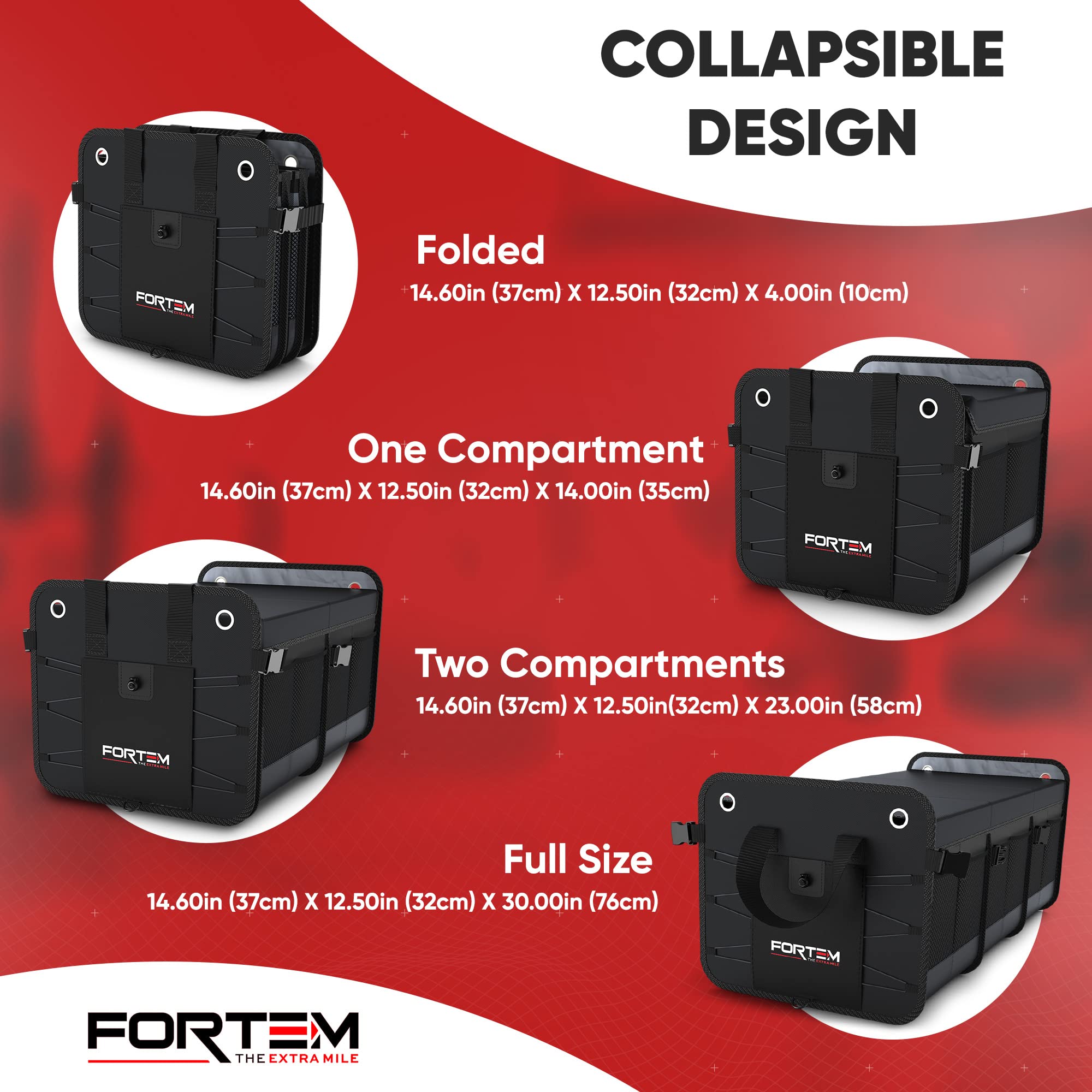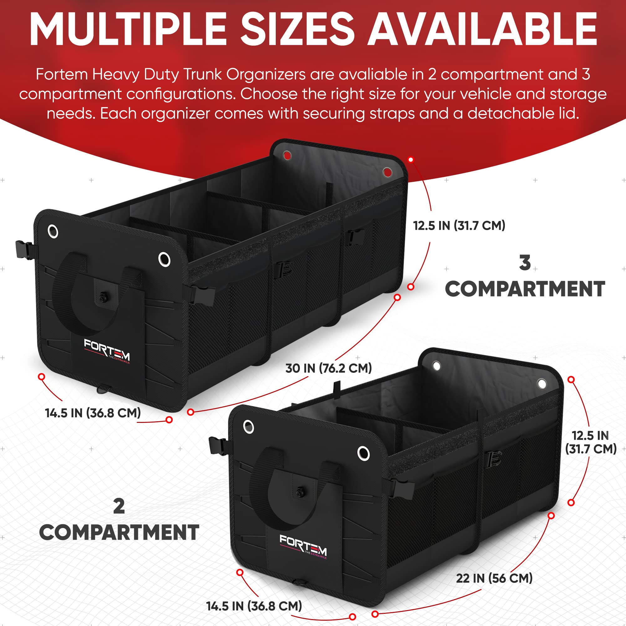 - Multifunctional – Fortem Trunk organizers and storage make car organization easy and simple. Organize a variety of products from groceries to office supplies, accessories (handbags, shoes,) or toys for kids. Consolidate the mess in your trunk and make room for your cooler or camp gear.