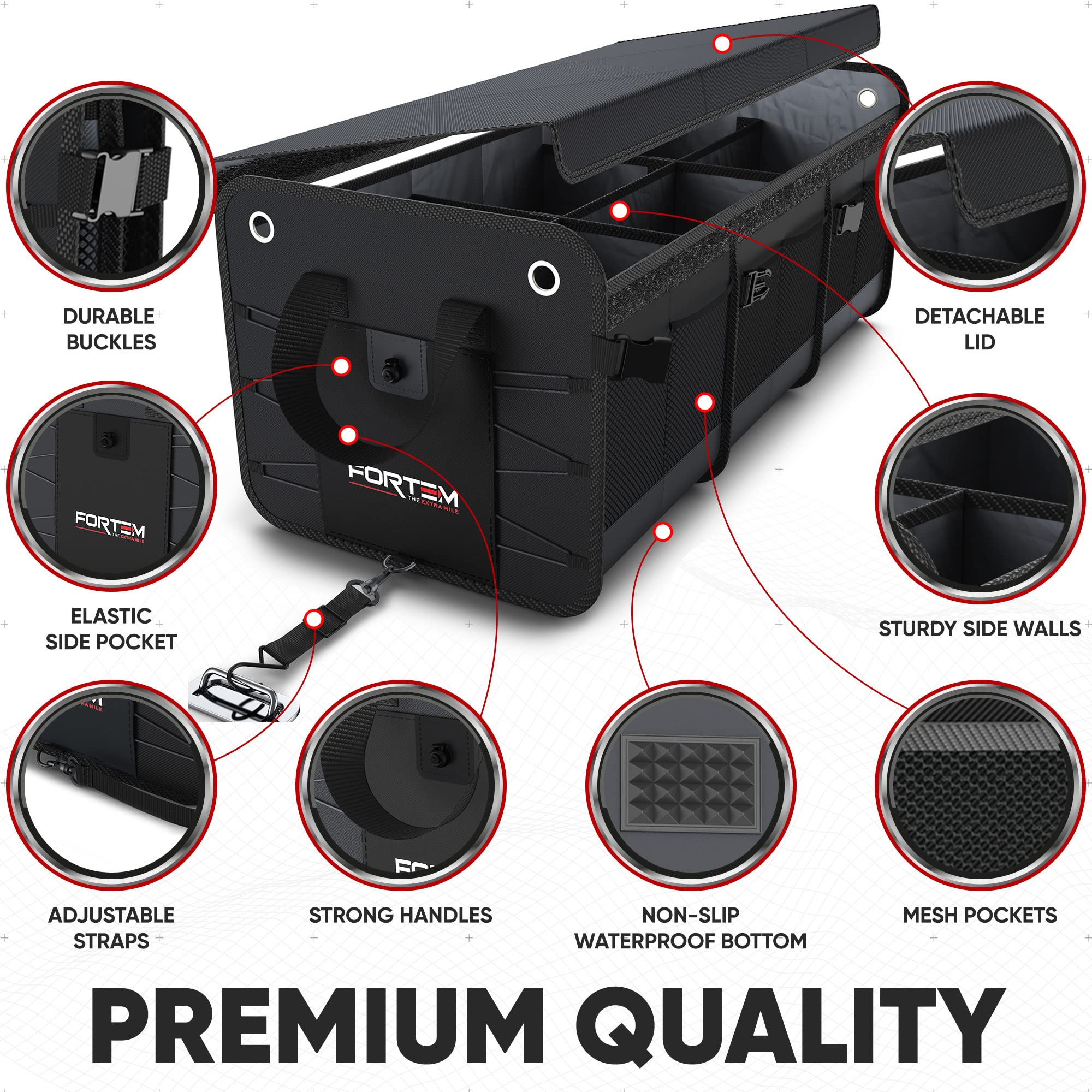 - Sturdy Box Design – Fortem premium trunk storage organizer for car is reinforced with rigid base plates to support every side panel. Among car organizers and storage, ours will leave less mess to worry about with multiple side pockets and up to 6 compartments. The bottom half of the organizer is also waterproof.