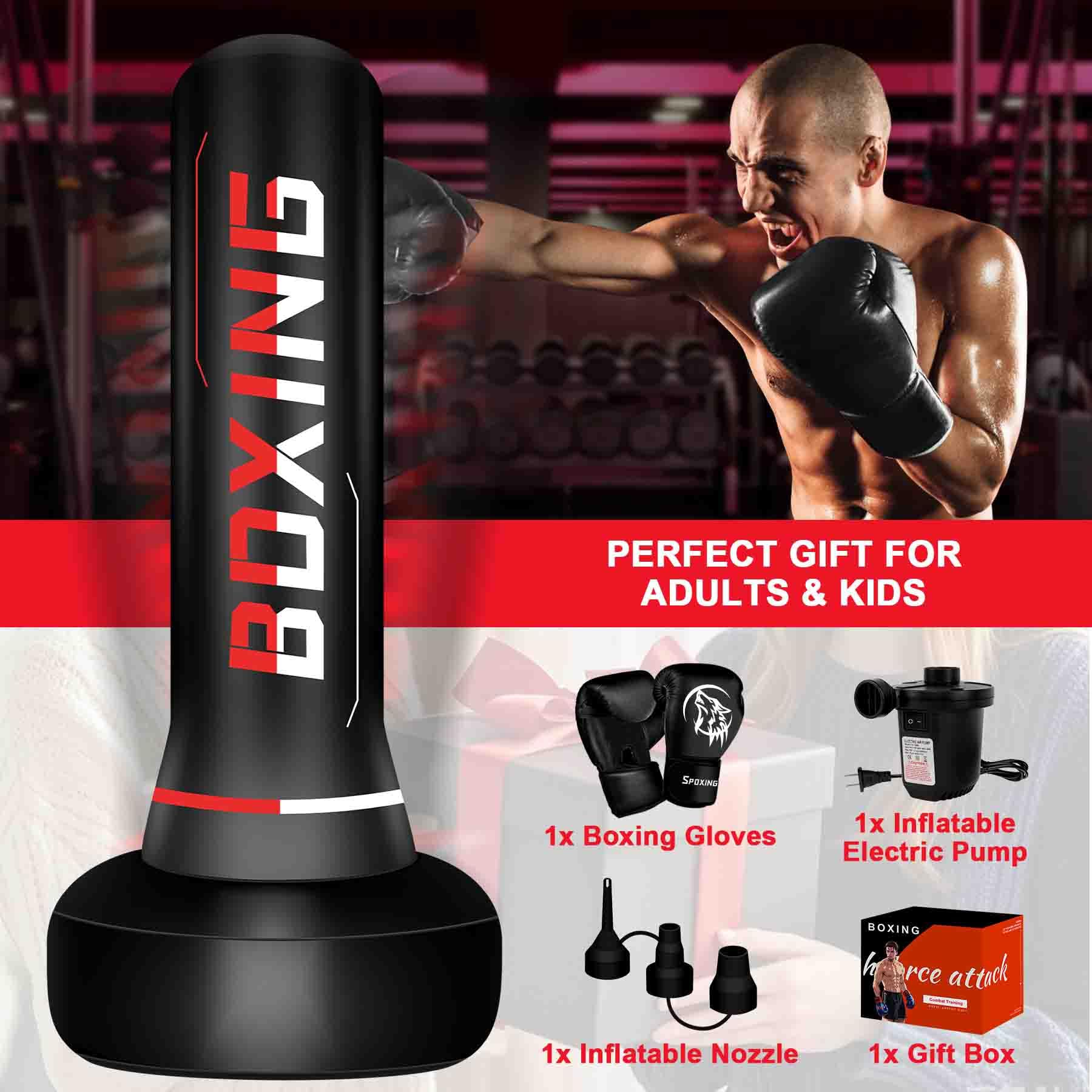• Upgraded Boxing Punching Bag Set: Our boxing training equipment includes a free-standing punching bag, a pair of boxing gloves, and an electric air pump. No need to purchase an extra pump—it's easy to inflate, saving you time and effort. The gloves feature thick padding and an adjustable wrist strap design, offering top-level protection for your hands, so you can punch with confidence and power