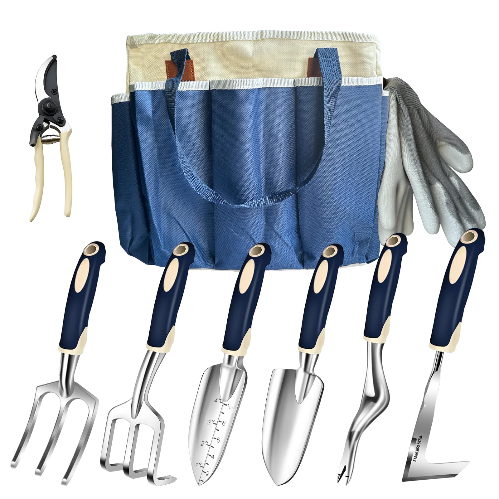 - Complete Tool Set-- The gardening tool set includes a small trowel, a large trowel, a hand rake, a hand fork, a weeder, a transplanting tool, pruning shears, gloves, and a tote bag, fully satisfying various gardening needs to make your work easier and more efficient.