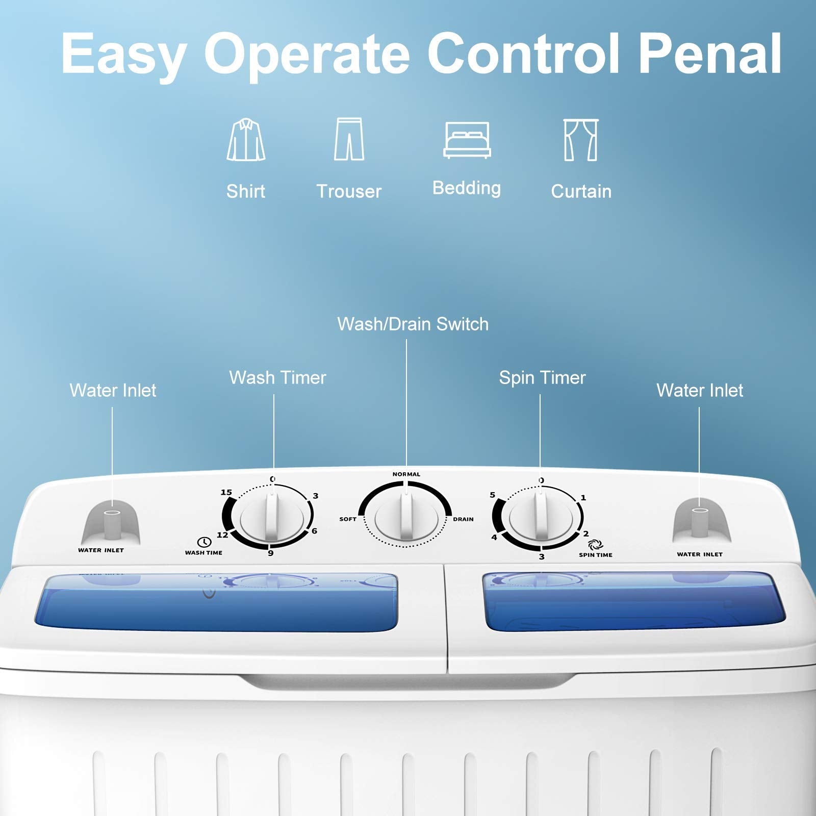 Introducing the Giantex GT24267-PE Portable Washing Machine - the ultimate solution for laundry on the go! With a 20lbs Spinner Combo and 12lbs washing capacity, this Compact Twin Tub Mini Washer is perfect for apartments, RVs, and dorms. Say goodbye to laundromat trips and hello to convenience with this Blue & White Portable Washing Machine.