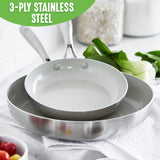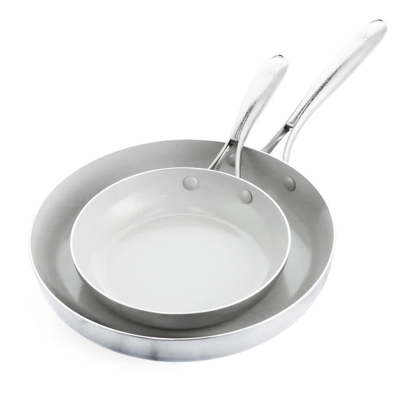 Details: Double down on easy with this handy pair of frying pans. Whether you’re looking for a pan for morning eggs or one-pan meals, this pair ensures you have everything you need to get cooking. Featuring two layers of stainless steel surround an aluminum core, this pan heats quickly, evenly, and performs as good as it looks. And it’s finished with our toxin-free ceramic nonstick coating, so everything you make will be a little healthier, too. That’s because our ceramic nonstick is not stuck in the past—our ceramic nonstick starts with sand and creates 60% fewer CO2 emissions during the curing phase than traditional coatings. Designed for effortless performance and cleanup, these frying pans are free of PFAS, PFOA, lead, and cadmium. This tri-ply pair’s coating is also reinforced with diamonds for incredible durability. For all stovetops, including induction. Oven safe up to 600°F. Dishwasher safe.