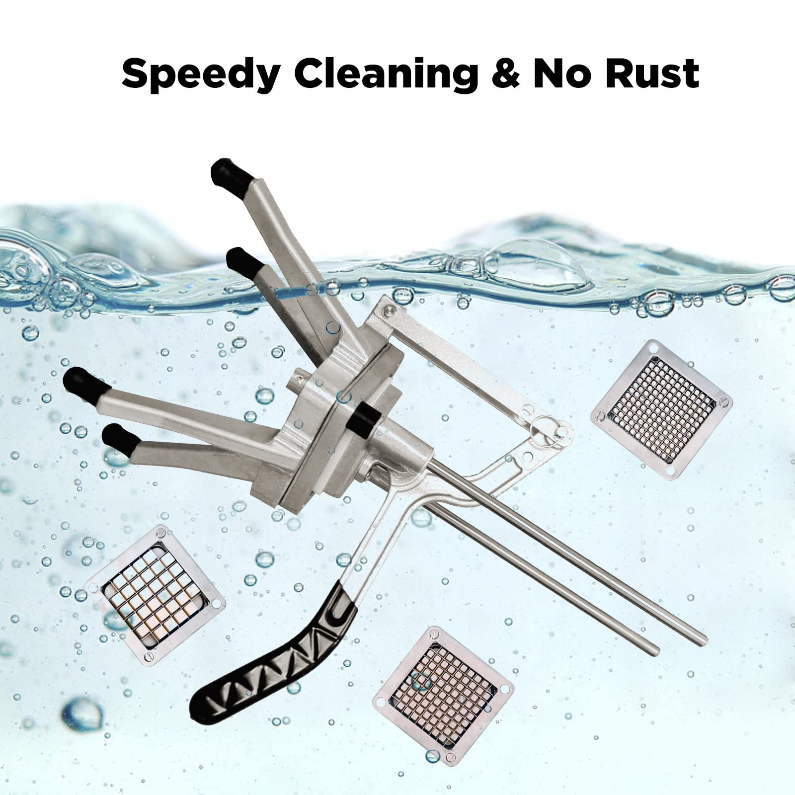 • Good Stability And Easy Cleaning: The four non-slip feet of the potato dicer are wear-proof, solid, shock-absorbing, non-slip and odorless, which ensures stability and performance during operation.Equipped with a cleaning brush and a peeling knife,the blades and push block are both removable and washable, easy to clean and maintain.