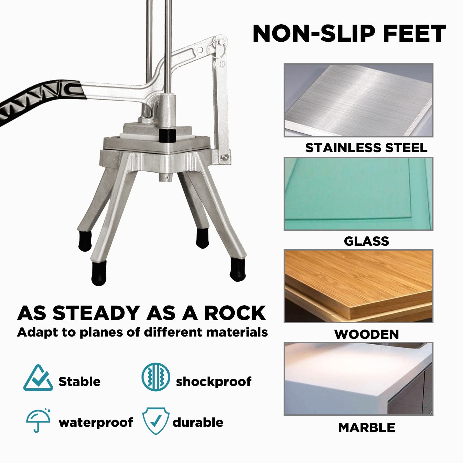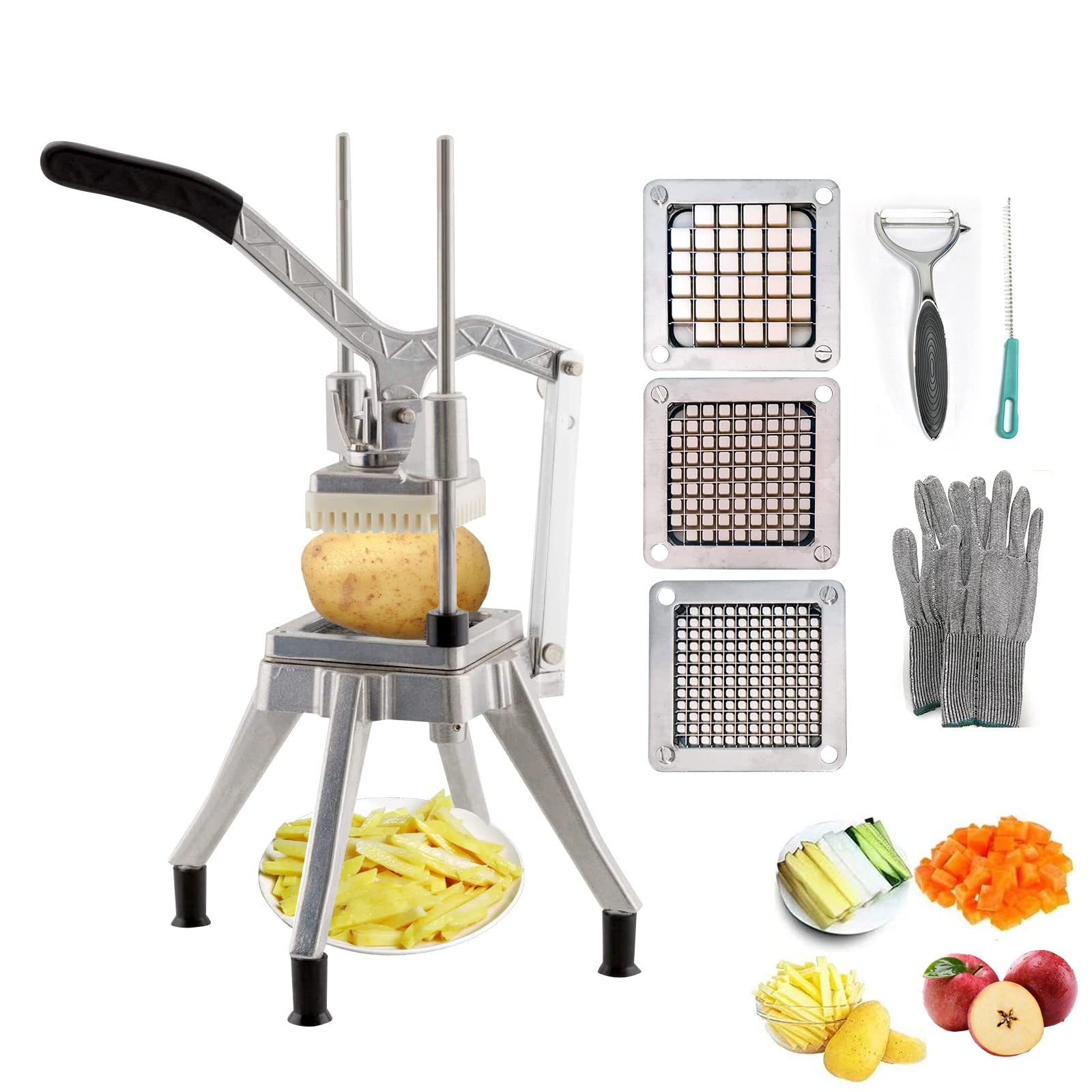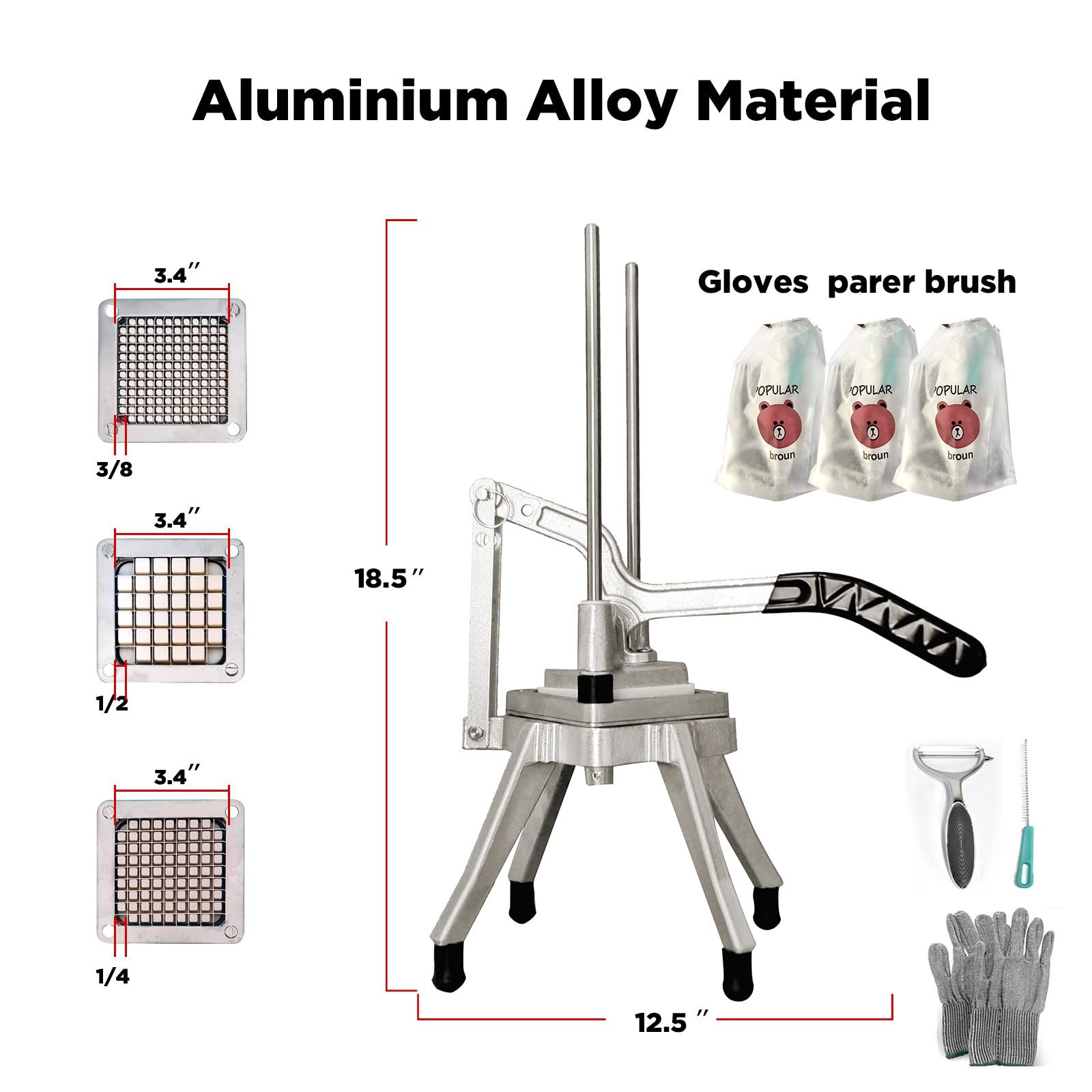 • 3 Blades Available:The sturdy commercial potato cutter is equipped with 3 sharp blades 1/2”, 3/8”and 1/4”.You can use this cutter to cut various vegetables and fruits into different sizes and shapes according to your own needs,which is very suitable for restaurants and home kitchens.