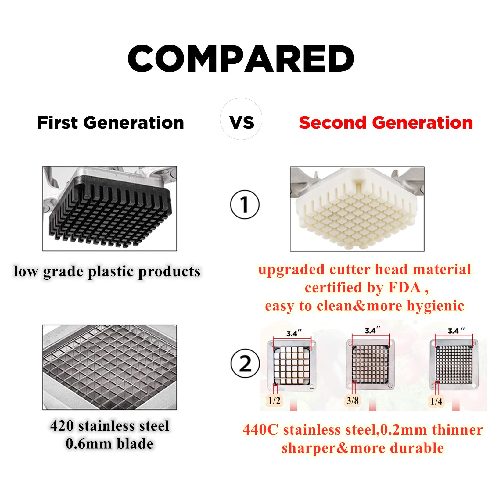 • Stainless Steel & Aluminum:The commercial vegetable chopper is made of heavy-duty stainless steel and aluminum alloy, durable and corrosion-proof.The upgraded white cutter head Material is more hygienic. High density refined 440c stainless steel blades guarantee its sharpness, not easy to be corroded by water or acid-alkaline food.