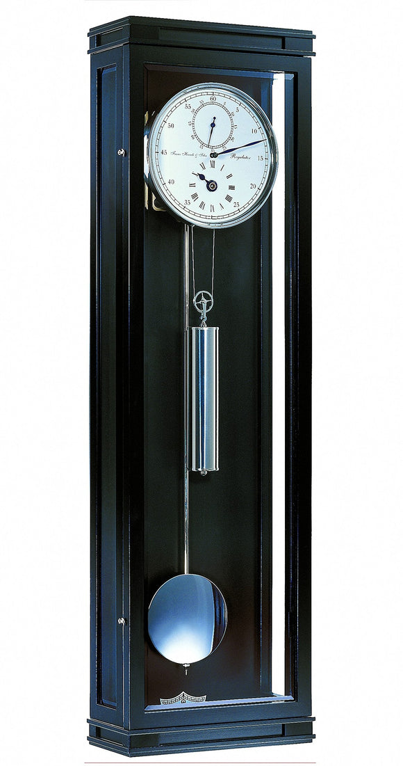 Details: Colour: Black Impressive case with hand polished black finish. Bevelled front and side glasses. Special regulator dial with separate hour, minute and second hand. Newly developed Hermle high precision movement only to be wound once a month. The solid anchor has rubin paletts. Movement has 6 ball bearings and 6 rubin bushings. Power reserve. Anchor setting can be done with a precision screw on the pendulum stick. The second hand makes 78 steps for a 1 minute turn. Numbered edition shown in dial with quality certificate. 2 years product warranty