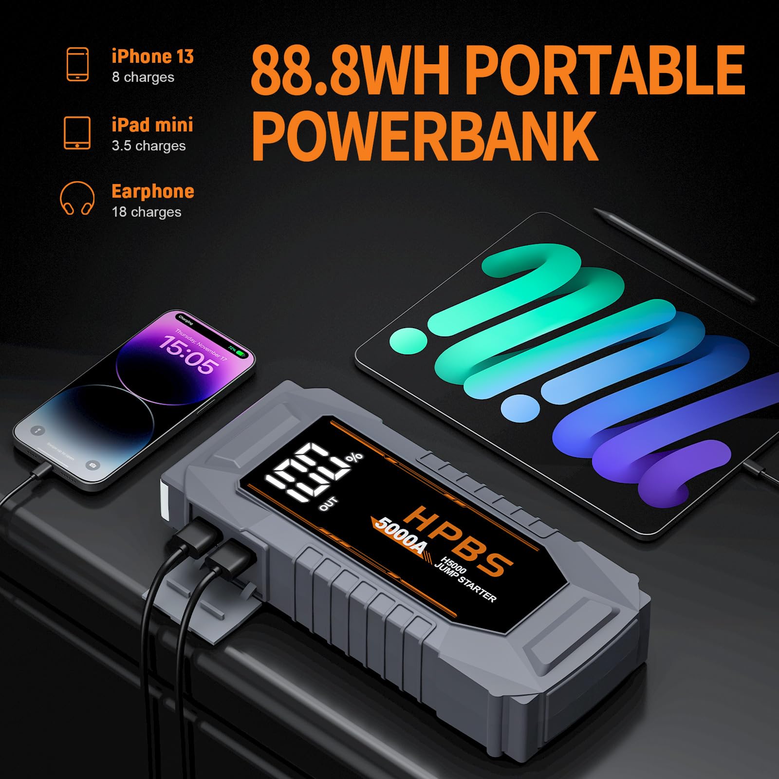 - 【5000A Car Battery Jump Starter】HPBS H5000 portable Jump Starter battery pack with the super 5000A peak. This jump pack Can easily jump-start (up to All gas or 10.0L diesel) 12v vehicles in 1-2 seconds. up to 80 times on a full charger.