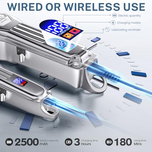 Introducing the KIKIDO Hair Clippers Professional Cordless for Men, the ultimate Barber Clippers for Hair Cutting Kit. This Wireless LCD Display Hair Trimmers Set is perfect for achieving a precise and stylish haircut at home or on the go. With its rechargeable feature, this sleek silver hair clipper is a must-have for every family.