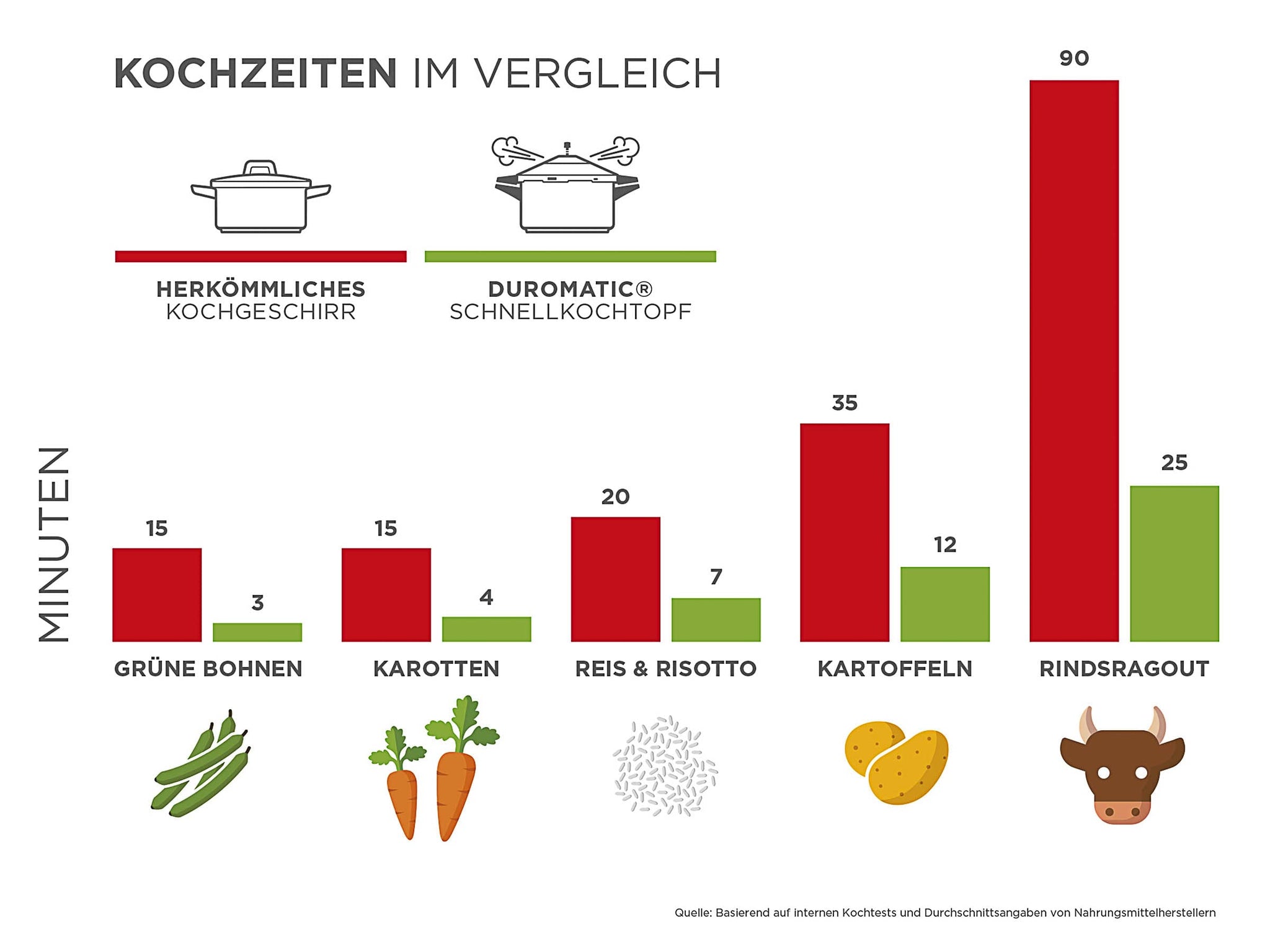 Product description Create meals in minutes with the Kuhn Rikon Duromatic pressure cookware saucepan. Made of stainless steel, this saucepan style cooker feeds eight to ten people. With up to 70% reduction in cooking time and 70% energy savings, this saucepan is both fast and environmentally friendly. This pressure cooker locks in vitamins, nutrients and flavor that are lost with conventional cookware -- making it easy for you to create healthy, delicious meals for yourself and your family, using a lot less energy and time. This saucepan includes a trivet for steaming and is backed by a 10 year manufacturer's warranty. 8-3/4" diameter, with a 7 quart capacity Amazon.com Beginning in the 1930s, two successive generations of busy cooks used pressure cookers to prepare family meals. The next generation, with memories of valves dancing and hissing on stovetops, snubbed pressure cookers. Now pressure cookers have come back, those old valves replaced by modern versions that ensure safety while delivering the speed, ease, and nutritional benefits of pressure cooking. Pressure cooking also saves 70 percent of the energy normally consumed while cooking. This heavyweight, stainless-steel beauty is a fine example of contemporary engineering and style. Its mirror finish gleams, and its black handles--including a loop handle for two-handed lifting--stay cool. Pressure-cooking traps steam to heat foods at temperatures higher than boiling. An aluminum disk in the base, sandwiched by stainless steel, speeds the process even more through fast heat conductivity. It's safe on electric, gas, ceramic, and induction stovetops. Little water is required, so nutrients, flavor, and color are not boiled away. Vegetables emerge vibrantly colored from the steamer insert. Stews, soups, beans--even meat loaf, pork chops, and desserts such as bread pudding--come out tasty and nutritious. (A booklet containing dozens of recipes is included.) You can brown meats in the pot before the lid is locked on, or use the pot without the lid. The stem of the operating valve shows high and low pressure so you can adjust heat for different foods. After cooking, the pressure can be reduced slowly (just let the cooker sit for a while), normally (press the pressure indicator), or quickly (run tepid water on the lid's rim). Safety measures abound: the lid twists onto the pot; a rubber gasket ensures a tight seal. A vent releases steam if pressure builds too high, as does a valve that also locks the lid when any pressure whatsoever is inside the cooker. Cleanup is a bit involved: hand wash the pot, gasket, and lid with a mild detergent, then lightly oil the gasket. Normally the valve is self-cleaning, but if food passes through it, disassembly is required. Minor cleaning in