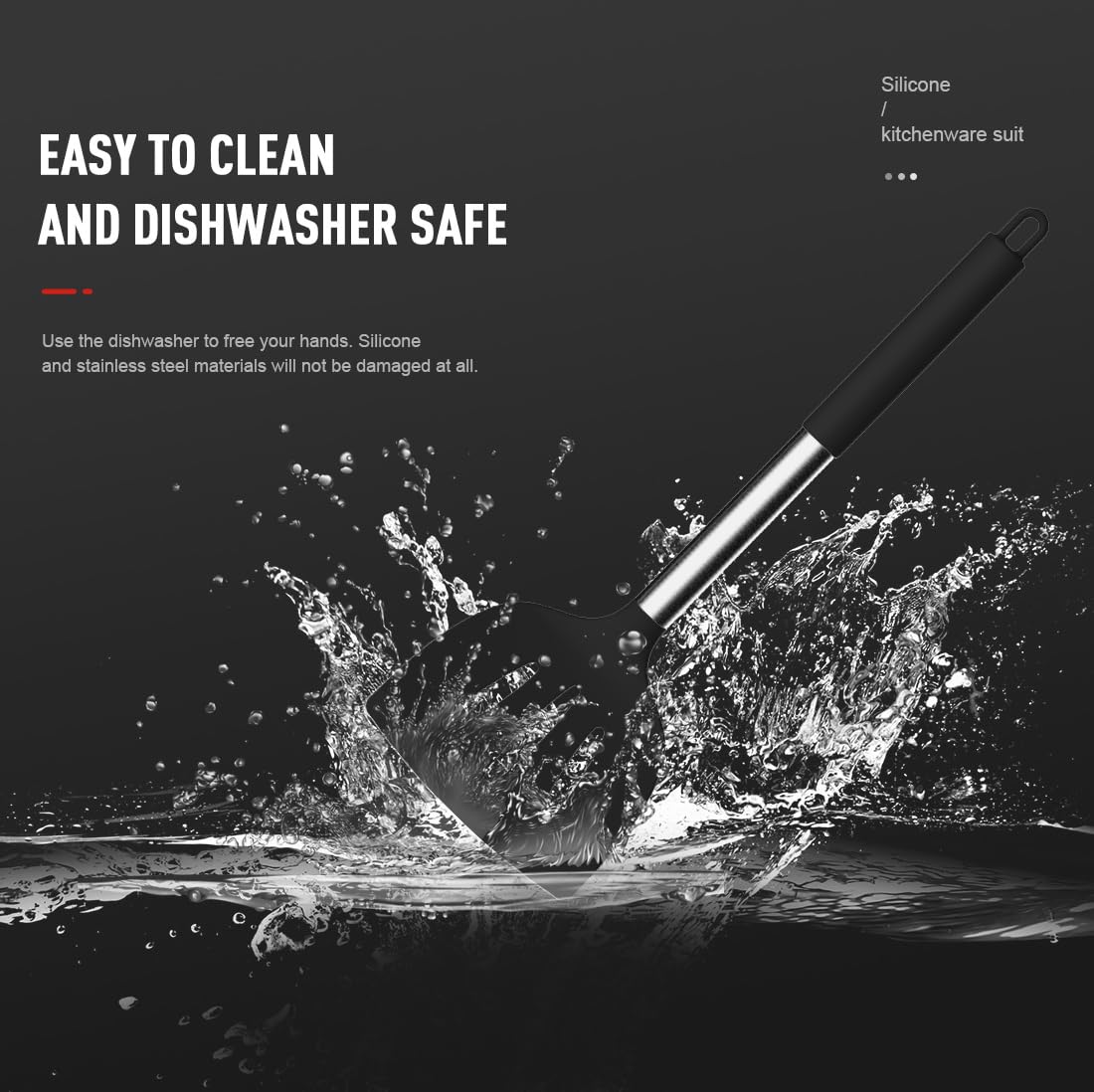 - CORRECT THE SHORTCOMINGS OF MOST KITCHEN UTENSILS. MEET MORE NEEDS - Cooking utensils of increased size no longer look like toys! more stronger and more practical. The perfect combination of 304 stainless steel handle and silicone not only prevents the transfer of heat but is fully compatible with dishwasher safety!Nanotechnology makes the silicone head and stainless steel connection more stable.The large kitchen utensils holder makes it easy to store all the kitchen tools
