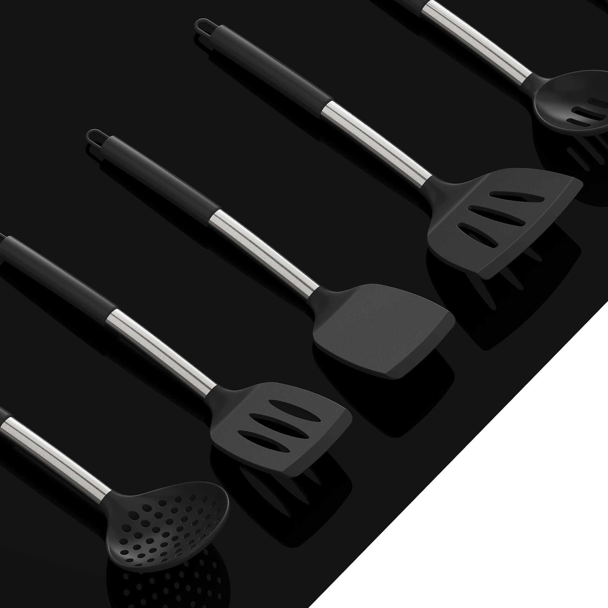 - HEAT-RESISTANT, NON-MELTING, ODORLESS - The Silicone Cooking Utensils can withstand temperatures up to 446°F, Even if they are used in the high temperature environment of frying, you don't have to worry that it will melt. It doesn't retain odors or colors when you use it for stirring deep-colored food.Deep Soup Ladle, Solid Serving Spoon, Slotted Spoon, Flexible Spatula, Round Spatula, Pasta Server, Slotted Turner, etc. are made from food grade silicone.protect your pot from being scratched